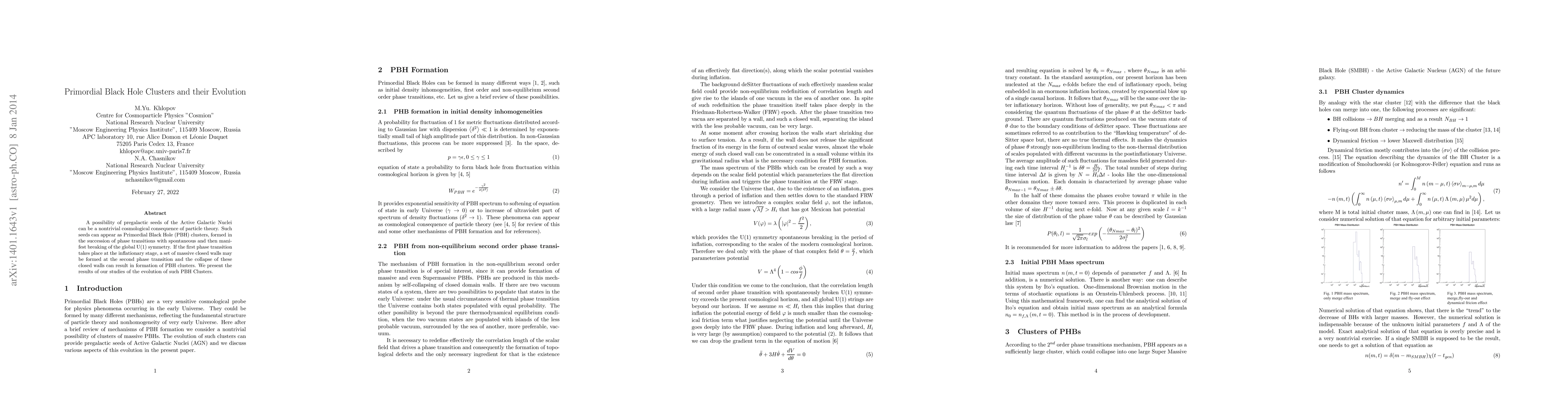 A possibility of pregalactic seeds of the Active Galactic Nuclei can be a nontrivial cosmological consequence of particle theory. Such seeds can appear as Primordial Black Hole (PBH) clusters, formed in the succession of phase transitions with spontaneous and then manifest breaking of the global U(1) symmetry. If the first phase transition takes place at the inflationary stage, a set of massive closed walls may be formed at the second phase transition and the collapse of these closed walls can result in formation of PBH clusters. We present the results of our studies of the evolution of such PBH Clusters.