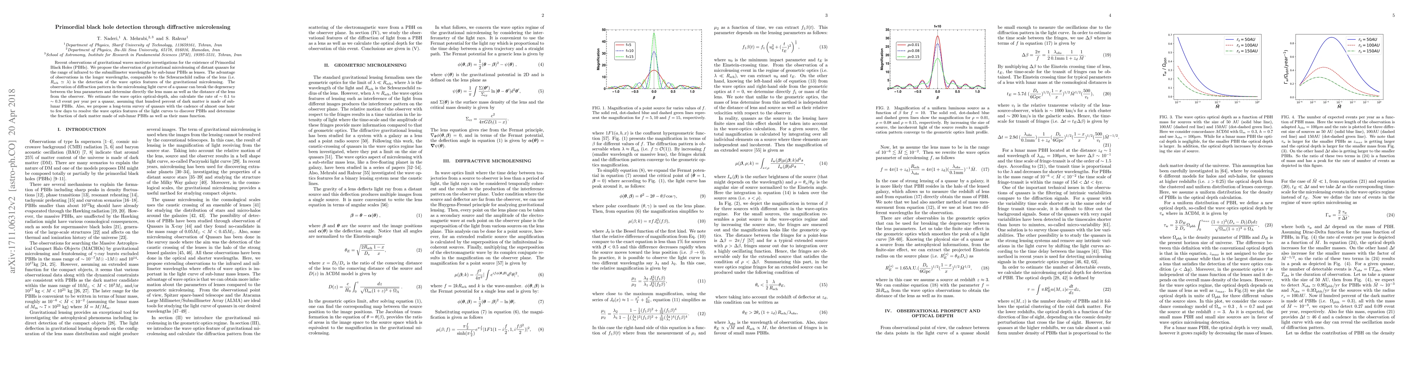 Recent observations of gravitational waves motivate investigations for the existence of Primordial Black Holes (PBHs). We propose the observation of gravitational microlensing of distant quasars for the range of infrared to the submillimeter wavelengths by sub-lunar PBHs as lenses. The advantage of observations in the longer wavelengths, comparable to the Schwarzschild radius of the lens (i.e. $R_{\rm sch}\simeq \lambda$) is the detection of the wave optics features of the gravitational microlensing. The observation of diffraction pattern in the microlensing light curve of a quasar can break the degeneracy between the lens parameters and determine directly the lens mass as well as the distance of the lens from the observer. We estimate the wave optics optical-depth, also calculate the rate of $\sim 0.1$ to $\sim 0.3$ event per year per a quasar, assuming that hundred percent of dark matter is made of sub-lunar PBHs. Also, we propose a long-term survey of quasars with the cadence of almost one hour to few days to resolve the wave optics features of the light curves to discover PBHs and determine the fraction of dark matter made of sub-lunar PBHs as well as their mass function.