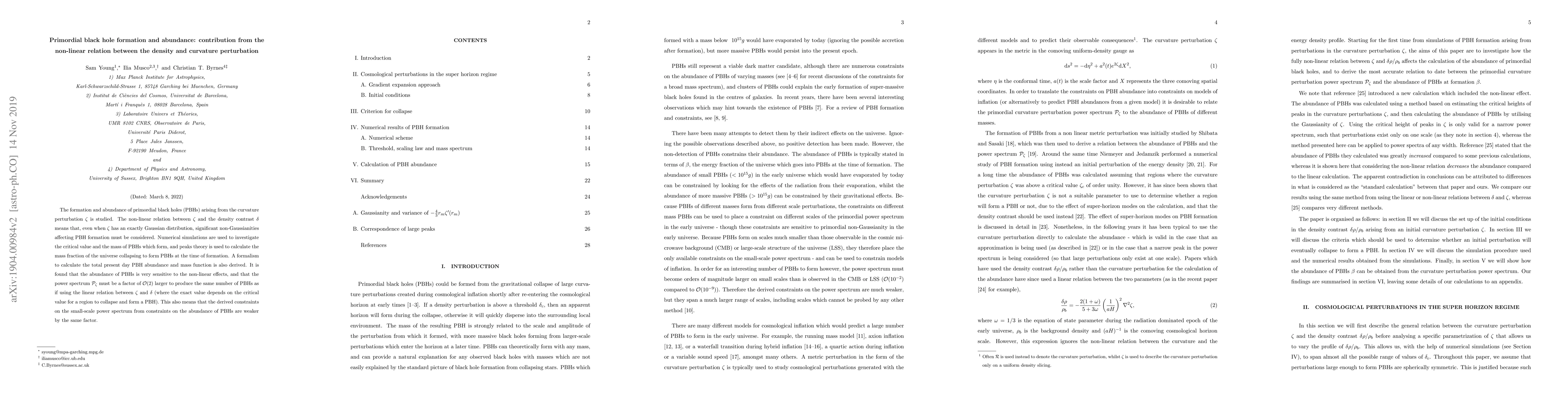 The formation and abundance of primordial black holes (PBHs) arising from the curvature perturbation $\zeta$ is studied. The non-linear relation between $\zeta$ and the density contrast $\delta$ means that, even when $\zeta$ has an exactly Gaussian distribution, significant non-Gaussianities affecting PBH formation must be considered. Numerical simulations are used to investigate the critical value and the mass of PBHs which form, and peaks theory is used to calculate the mass fraction of the universe collapsing to form PBHs at the time of formation. A formalism to calculate the total present day PBH abundance and mass function is also derived. It is found that the abundance of PBHs is very sensitive to the non-linear effects, and that the power spectrum $\mathcal{P}_\zeta$ must be a factor of $\sim2$ larger to produce the same number of PBHs as the linear model (where the exact value depends on the critical value for a region to collapse and form a PBH). This also means that the derived constraints on the small-scale power spectrum from constraints on the abundance of PBHs are weaker by the same factor.