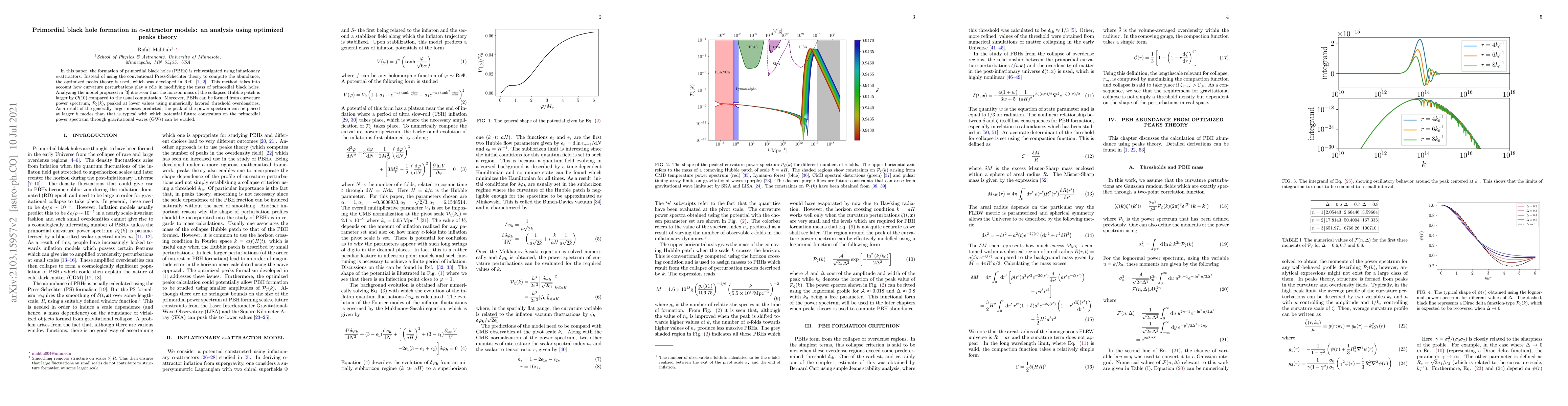 In this paper, the formation of primordial black holes (PBHs) is reinvestigated using inflationary $\alpha$-attractors. Instead of using the conventional Press-Schechter theory to compute the abundance, the optimized peaks theory is used, which was developed in Ref. \cite{Yoo:2018kvb,Yoo:2020dkz}. This method takes into account how curvature perturbations play a r\^{o}le in modifying the mass of primordial black holes. Analyzing the model proposed in \cite{Mahbub:2019uhl} it is seen that the horizon mass of the collapsed Hubble patch is larger by $\mathcal{O}(10)$ compared to the usual computation. Moreover, PBHs can be formed from curvature power spectrum, $\mathcal{P}_{\zeta}(k)$, peaked at lower values using numerically favored threshold overdensities. As a result of the generally larger masses predicted, the peak of the power spectrum can be placed at larger $k$ modes than that is typical with which potential future constraints on the primordial power spectrum through gravitational waves (GWs) can be evaded.
