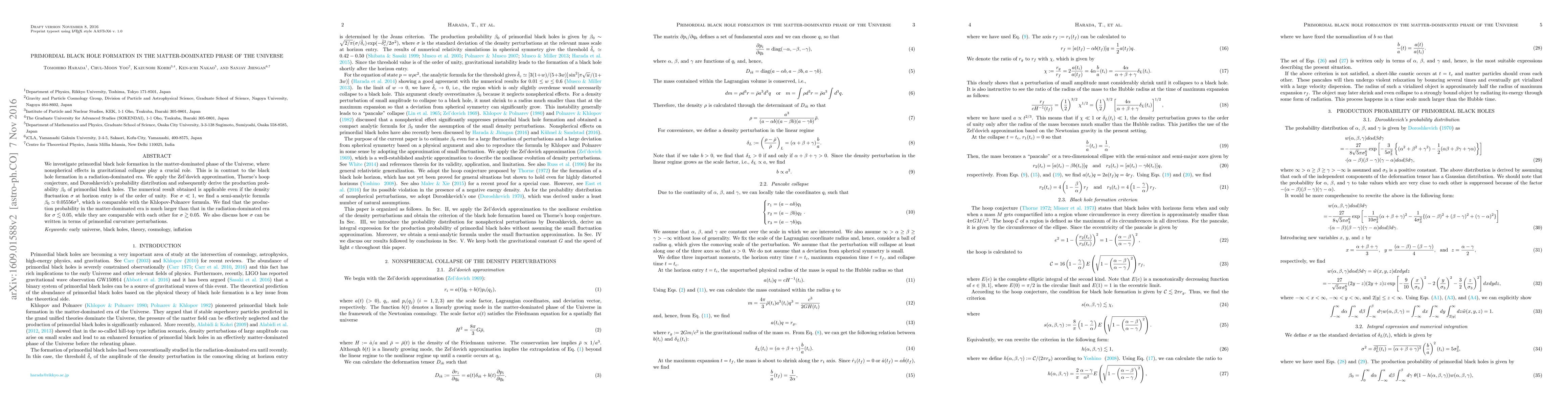 This paper explores the formation of primordial black holes during the matter-dominated phase of the Universe, using nonspherical gravitational collapse effects. It derives a production probability $\beta_{0}$ and finds that the probability is significantly higher in the matter-dominated era compared to the radiation-dominated era.