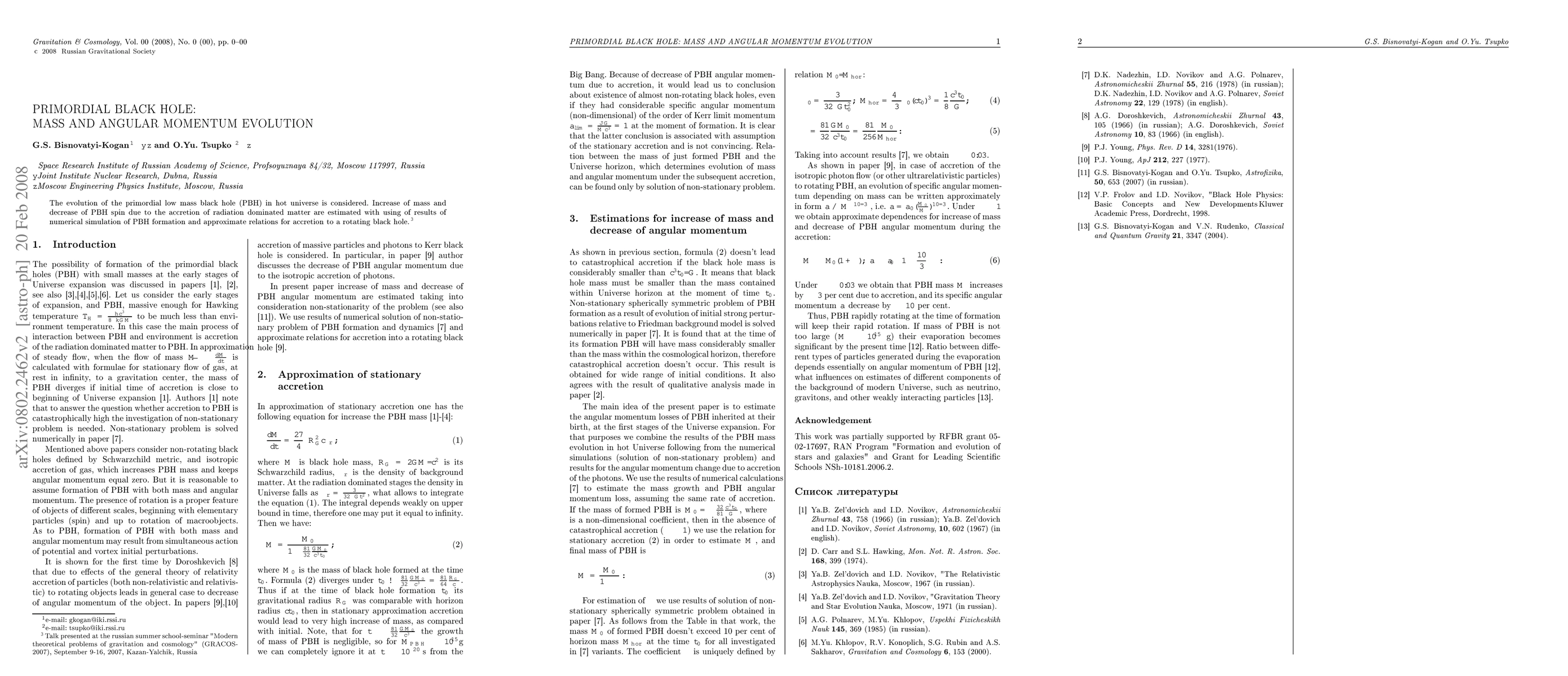 The evolution of the primordial low mass black hole (PBH) in hot universe is considered. Increase of mass and decrease of PBH spin due to the accretion of radiation dominated matter are estimated with using of results of numerical simulation of PBH formation and approximate relations for accretion to a rotating black hole.
