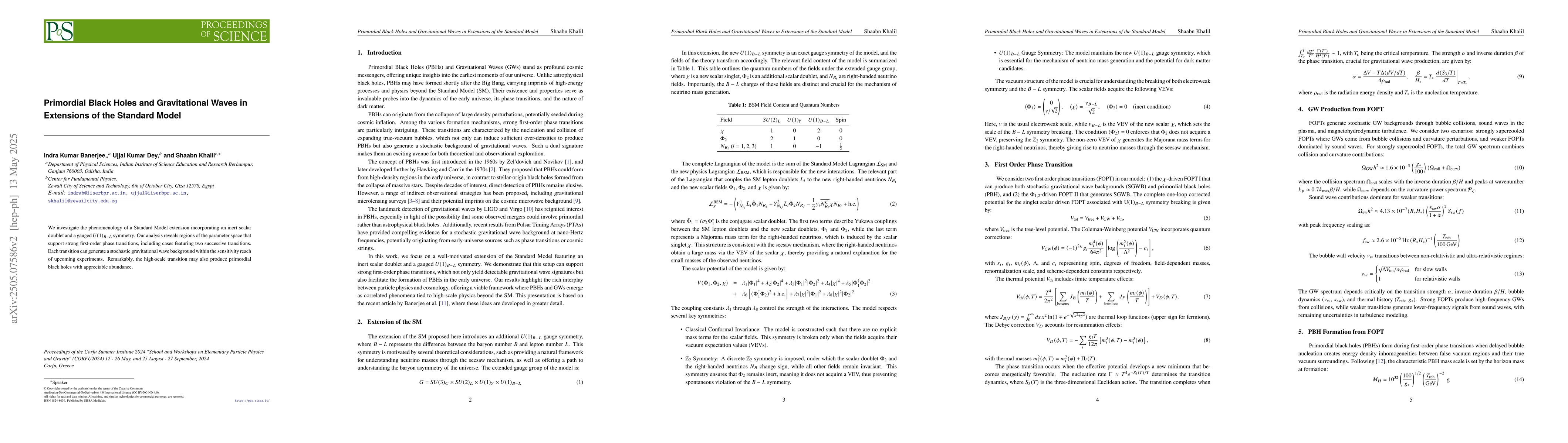 The paper presents a detailed analysis of phase transitions in an extended Standard Model with an inert scalar doublet and $U(1)_{B-L}$ symmetry, linking these transitions to gravitational waves and primordial black holes.