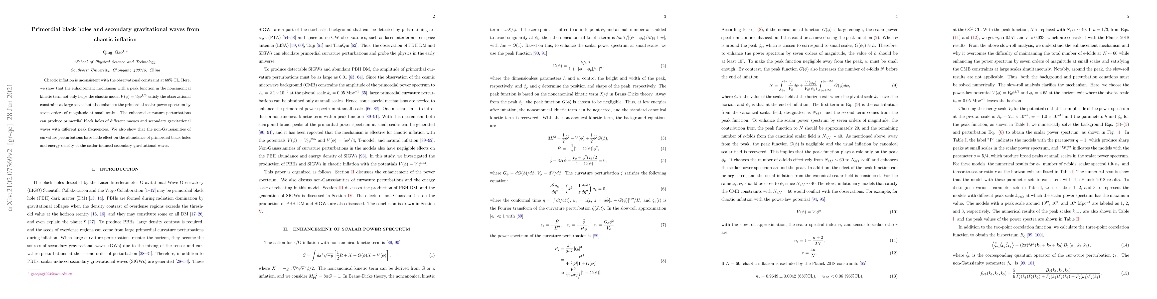 This paper explores how a modified chaotic inflation model, featuring a peak function in the noncanonical kinetic term, satisfies observational constraints while significantly boosting the primordial scalar power spectrum. This enhancement leads to the formation of primordial black holes and secondary gravitational waves, with minimal impact from non-Gaussianities.