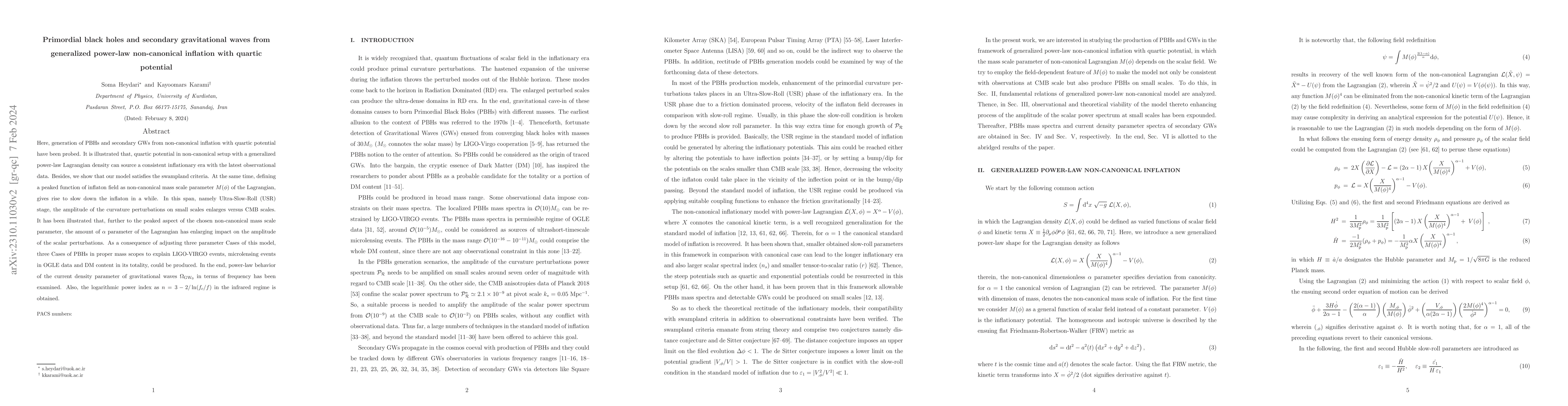 This paper explores the generation of primordial black holes (PBHs) and secondary gravitational waves (GWs) from generalized power-law non-canonical inflation with a quartic potential. It demonstrates that this model can produce a consistent inflationary era and satisfies the swampland criteria, leading to the formation of PBHs in mass ranges that could explain LIGO-VIRGO events, microlensing, and dark matter content.