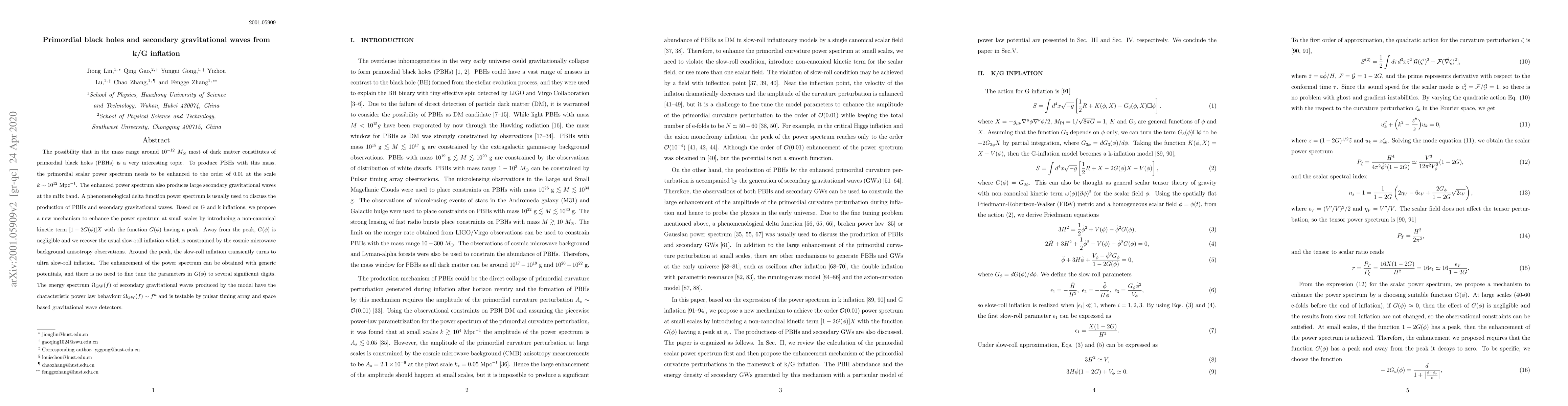 The possibility that in the mass range around $10^{-12}\ M_\odot$ most of dark matter constitutes of primordial black holes (PBHs) is a very interesting topic. To produce PBHs with this mass, the primordial scalar power spectrum needs to be enhanced to the order of 0.01 at the scale $k\sim 10^{12}\ \text{Mpc}^{-1}$. The enhanced power spectrum also produces large secondary gravitational waves at the mHz band. A phenomenological delta function power spectrum is usually used to discuss the production of PBHs and secondary gravitational waves. Based on G and k inflations, we propose a new mechanism to enhance the power spectrum at small scales by introducing a non-canonical kinetic term $[1-2G(\phi)]X$ with the function $G(\phi)$ having a peak. Away from the peak, $G(\phi)$ is negligible and we recover the usual slow-roll inflation which is constrained by the cosmic microwave background anisotrpy observations. Around the peak, the slow-roll inflation transiently turns to ultra slow-roll inflation. The enhancement of the power spectrum can be obtained with generic potentials, and there is no need to fine tune the parameters in $G(\phi)$. The energy spectrum $\Omega_{GW}(f)$ of secondary gravitational waves have the characteristic power law behaviour $\Omega_{GW}(f)\sim f^{n}$ and is testable by pulsar timing array and space based gravitational wave detectors.