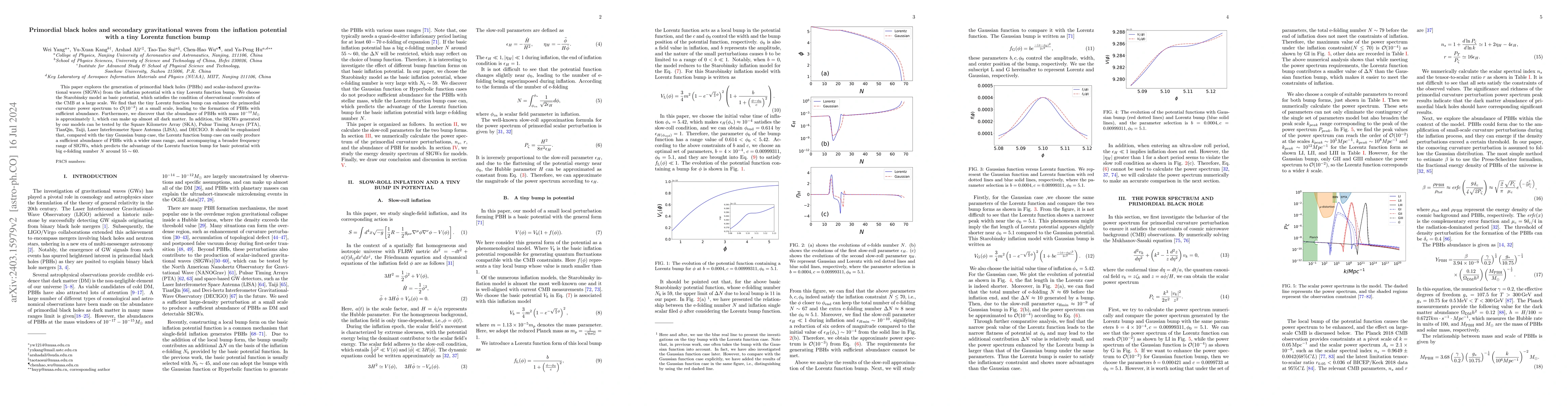 This paper explores the generation of primordial black holes (PBHs) and scalar-induced gravitational waves (SIGWs) from the inflation potential with a tiny bump. We propose a Lorentz function that makes a tiny bump characteristic of the inflation model potential. This property makes the scalar field move locally ultra slowly, which not only makes the primordial curvature power spectrum have $\mathcal{O}(10^{-2})$ peaks at a small scale but also satisfies observational constraints of the cosmic microwave background (CMB) on a large scale. Specifically, we calculate the abundances of PBHs for different mass ranges in this model, where PBHs with mass $10^{-12}M_\odot$ can make up almost all dark matter and PBHs with mass $10^{-5}M_\odot$ can explain OGLE ultrashort-timescale microlensing events. Moreover, we find that SIGWs accompanying the PBHs can be tested by the Square Kilometre Array (SKA), TianQin, Taiji, Laser Interferometer Space Antenna (LISA), and DECIGO. As for the parameter set I, the consequent SIGWs can explain the NANOGrav 12.5yrs signal.