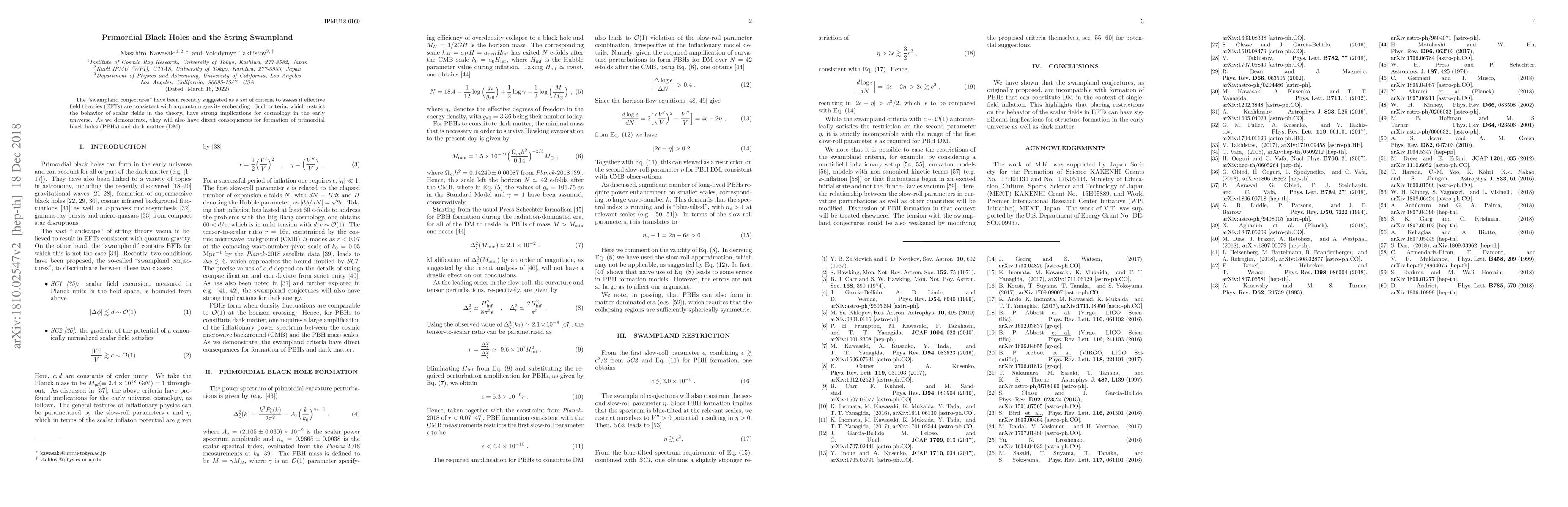 The "swampland conjectures" have been recently suggested as a set of criteria to assess if effective field theories (EFTs) are consistent with a quantum gravity embedding. Such criteria, which restrict the behavior of scalar fields in the theory, have strong implications for cosmology in the early universe. As we demonstrate, they will also have direct consequences for formation of primordial black holes (PBHs) and dark matter (DM).