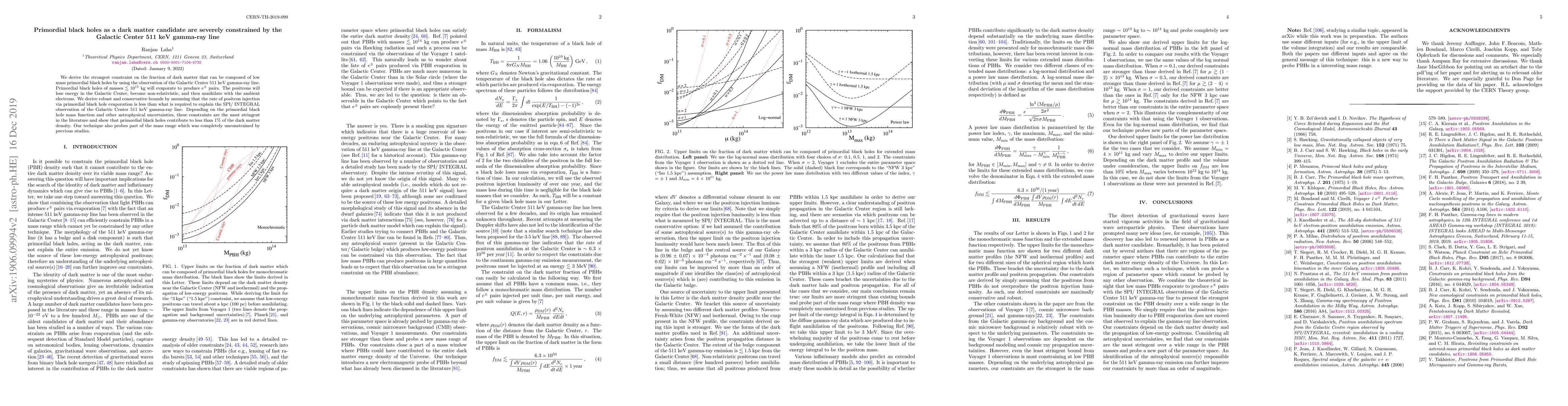 This paper establishes the strongest constraints on primordial black holes as dark matter candidates using the Galactic Center's 511 keV gamma-ray line, showing they contribute less than 1% to dark matter density. The analysis finds that low mass primordial black holes evaporating to produce positrons are limited by the observed gamma-ray line, thus probing a previously unconstrained mass range.