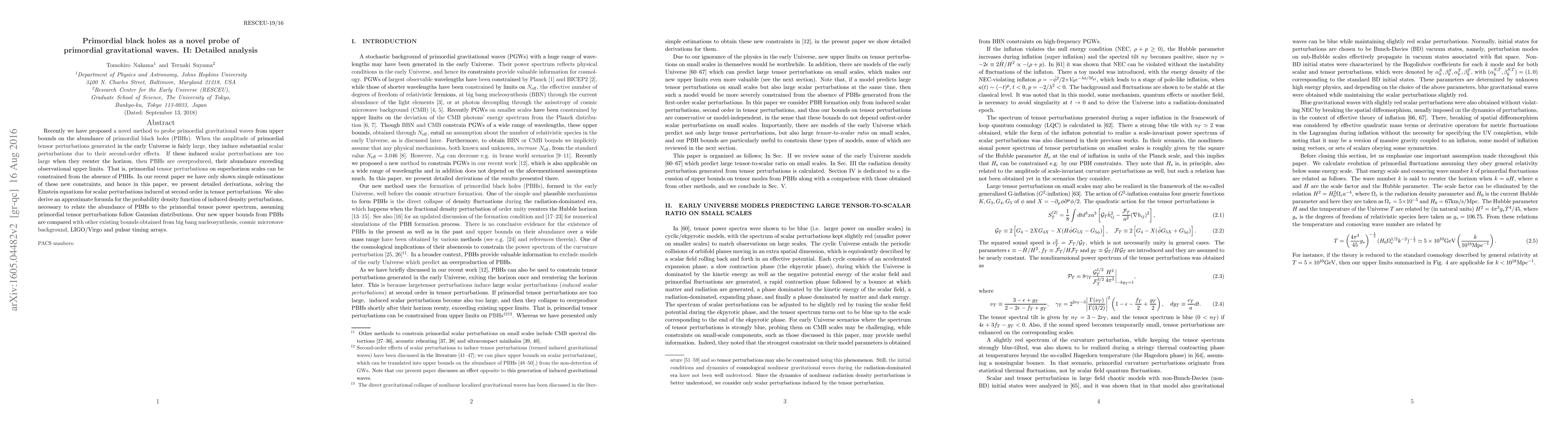 This paper provides detailed derivations to constrain primordial gravitational waves through the upper limits on primordial black hole (PBH) abundance, solving the Einstein equations for scalar perturbations induced by tensor perturbations. It also derives an approximate formula for the probability density function of induced density perturbations, comparing new PBH-based bounds with existing constraints from various cosmological observations.