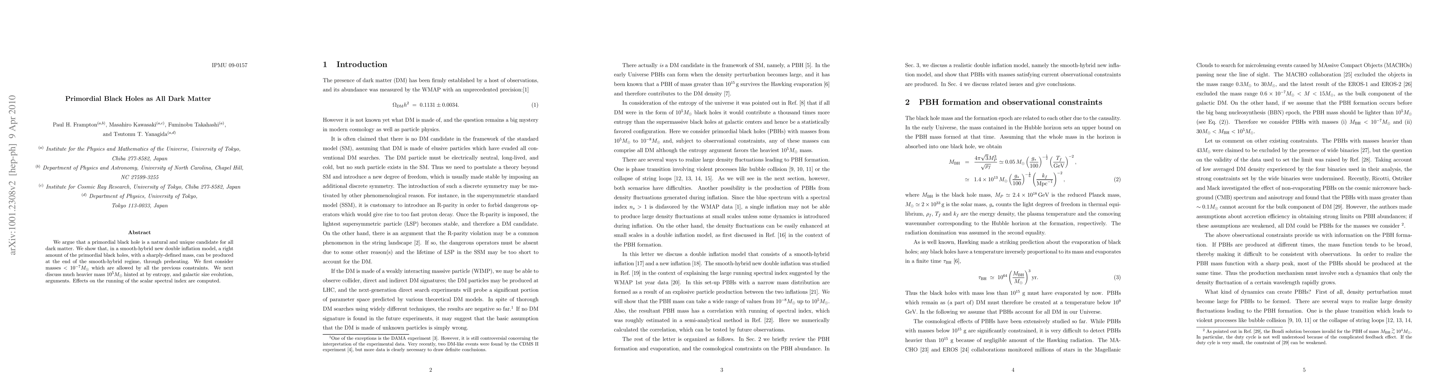 We argue that a primordial black hole is a natural and unique candidate for all dark matter. We show that, in a smooth-hybrid new double inflation model, a right amount of the primordial black holes, with a sharply-defined mass, can be produced at the end of the smooth-hybrid regime, through preheating. We first consider masses < 10^(-7)M_sun which are allowed by all the previous constraints. We next discuss much heavier mass 10^5 M_sun hinted at by entropy, and galactic size evolution, arguments. Effects on the running of the scalar spectral index are computed.