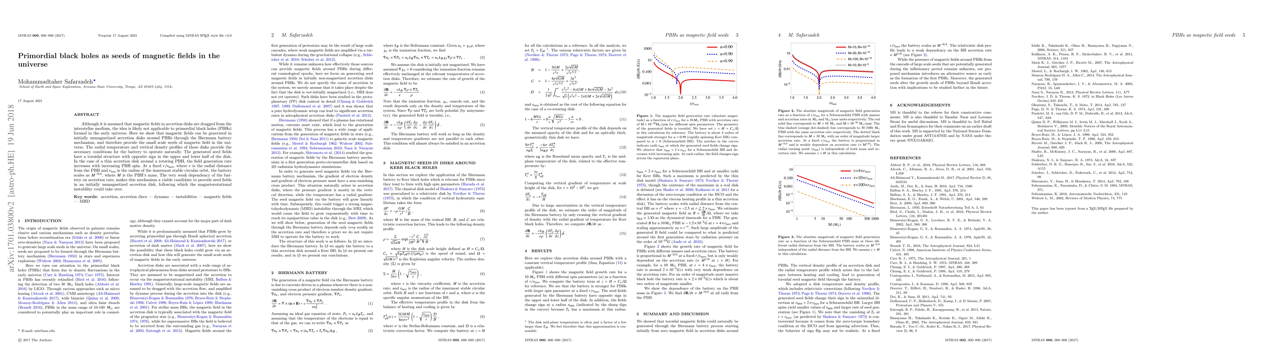 Although it is assumed that magnetic fields in accretion disks are dragged from the interstellar medium, the idea is likely not applicable to primordial black holes (PBHs) formed in the early universe. Here we show that magnetic fields can be generated in initially unmagnetized accretion disks around PBHs through the Biermann battery mechanism, and therefore provide the small scale seeds of magnetic field in the universe. The radial temperature and vertical density profiles of these disks provide the necessary conditions for the battery to operate naturally. The generated seed fields have a toroidal structure with opposite sign in the upper and lower half of the disk. In the case of a thin accretion disk around a rotating PBH, the field generation rate increases with increasing PBH spin. At a fixed $r/r_{\rm isco}$, where $r$ is the radial distance from the PBH and $r_{\rm isco}$ is the radius of the innermost stable circular orbit, the battery scales as $M^{-9/4}$, where $M$ is the PBH's mass. The very weak dependency of the battery on accretion rate, makes this mechanism a viable candidate to provide seed fields in an initially unmagnetized accretion disk, following which the magnetorotational instability could take over.