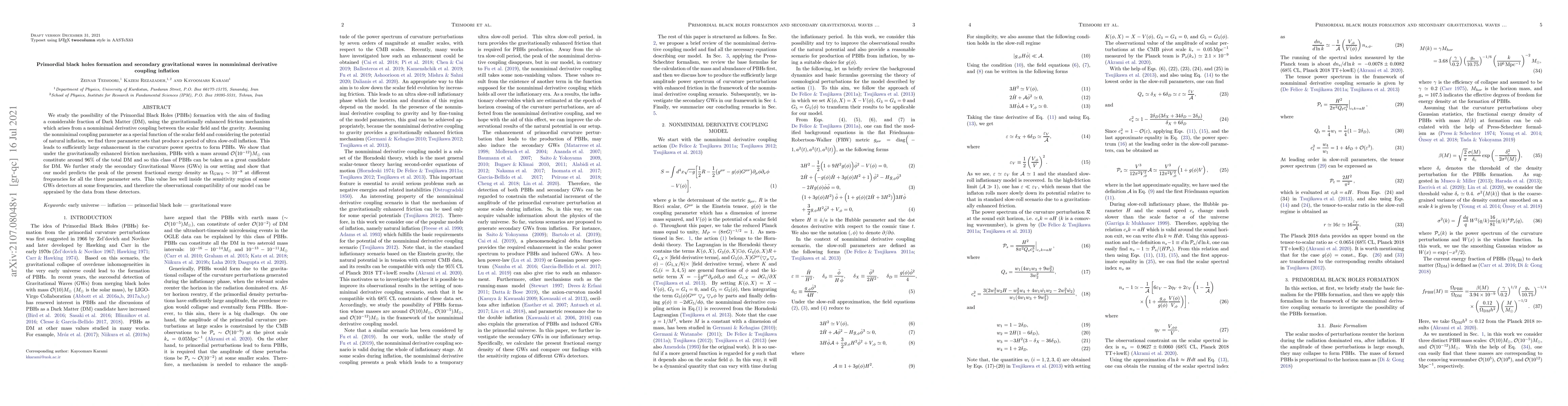 This paper explores the formation of Primordial Black Holes (PBHs) as a potential source of Dark Matter (DM) through a nonminimal derivative coupling inflation model, predicting PBHs with masses around ${\cal O}\big(10^{-12}\big)M_\odot$ could constitute up to $96\%$ of DM. It also investigates secondary gravitational waves, predicting an energy density $\Omega_{GW0} \sim 10^{-8}$ detectable by future gravitational wave detectors.
