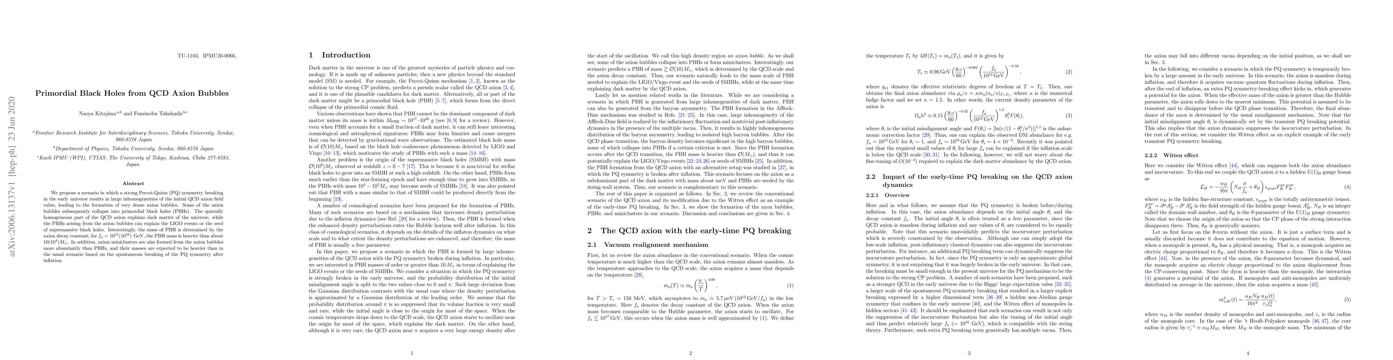 This paper proposes a mechanism where strong Peccei-Quinn symmetry breaking in the early universe leads to the formation of dense axion bubbles, some of which collapse into primordial black holes (PBHs) that could explain LIGO events or supermassive black holes. The PBH mass is determined by the axion decay constant, with heavier masses for larger decay constants.