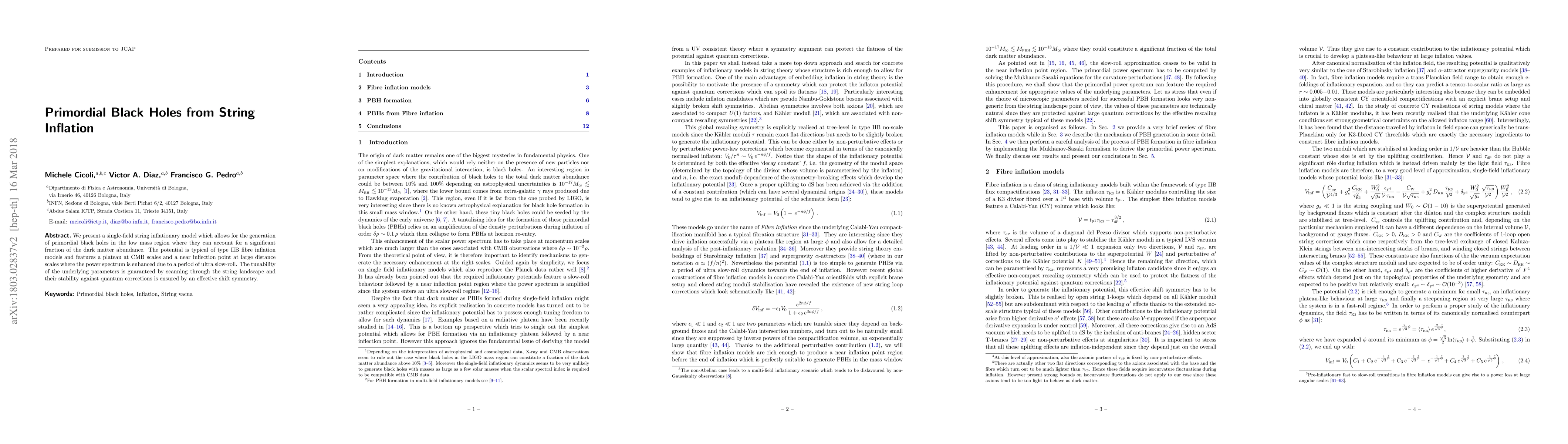 This paper explores a single-field string inflationary model that generates low-mass primordial black holes, potentially accounting for a significant portion of dark matter. The model features a plateau potential with an enhanced power spectrum due to ultra slow-roll, ensuring stability through an effective shift symmetry.