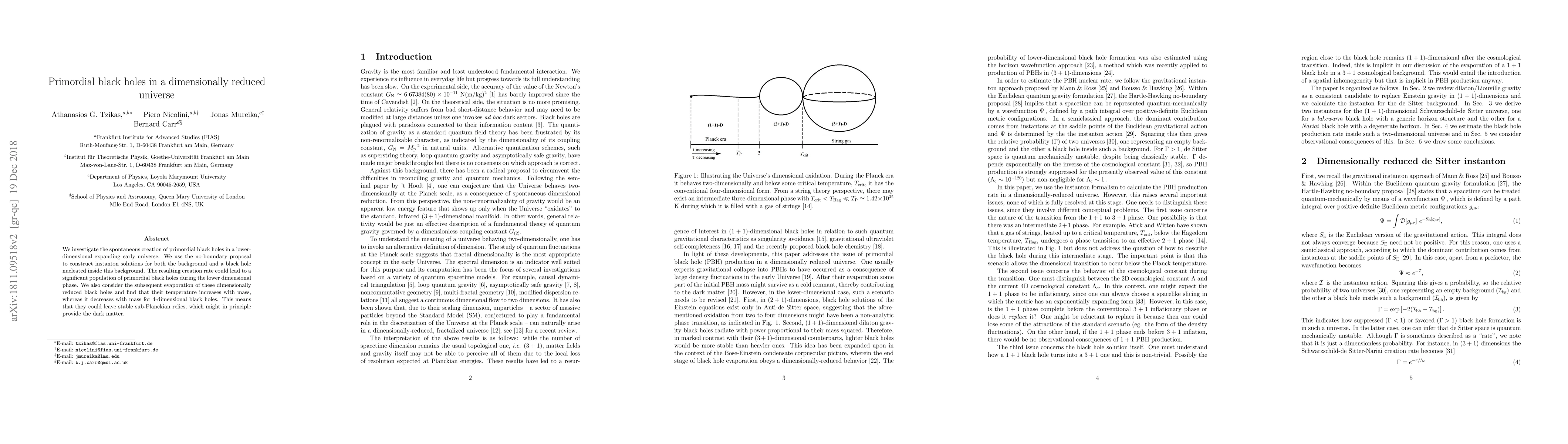 We investigate the spontaneous creation of primordial black holes in a lower-dimensional expanding early universe. We use the no-boundary proposal to construct instanton solutions for both the background and a black hole nucleated inside this background. The resulting creation rate could lead to a significant population of primordial black holes during the lower dimensional phase. We also consider the subsequent evaporation of these dimensionally reduced black holes and find that their temperature increases with mass, whereas it decreases with mass for 4-dimensional black holes. This means that they could leave stable sub-Planckian relics, which might in principle provide the dark matter.