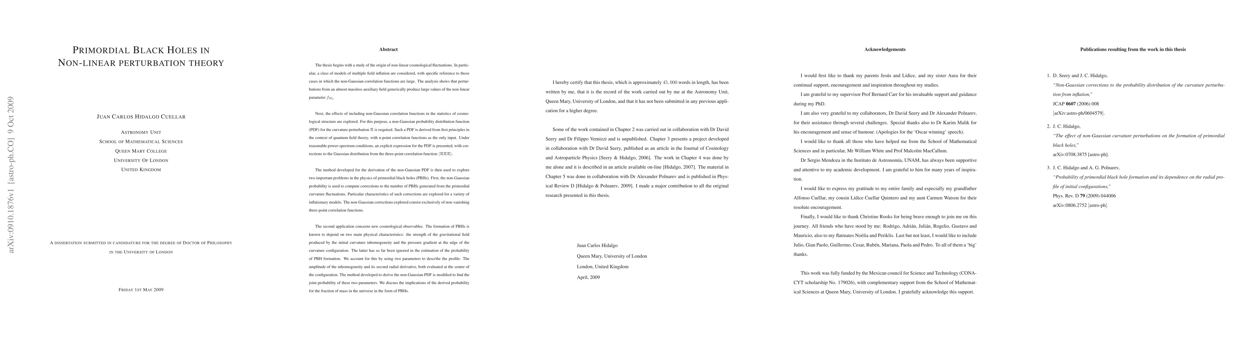 This thesis begins with a study of the origin of cosmological fluctuations with special attention to those cases in which the non-Gaussian correlation functions are large. The analysis shows that perturbations from an almost massless auxiliary field generically produce large values of the non-linear parameter f_NL. The effects of including non-Gaussian correlation functions in the statistics of cosmological structure are explored by constructing a non-Gaussian probability distribution function (PDF). Such PDF is derived for the comoving curvature perturbation from first principles in the context of quantum field theory, with n-point correlation functions as the only input. The non-Gaussian PDF is then used to explore two important problems in the physics of primordial black holes (PBHs): First, to compute non-Gaussian corrections to the number of PBHs generated from the primordial curvature fluctuations. The second application concerns new cosmological observables. The formation of PBHs is known to depend on two main physical characteristics: the strength of the gravitational field produced by the initial curvature inhomogeneity and the pressure gradient at the edge of the curvature configuration. We account for the probability of finding these configurations by using two parameters: The amplitude of the inhomogeneity and its second radial derivative, evaluated at the centre of the configuration. The implications of the derived probability for the fraction of mass in the universe in the form of PBHs are discussed.