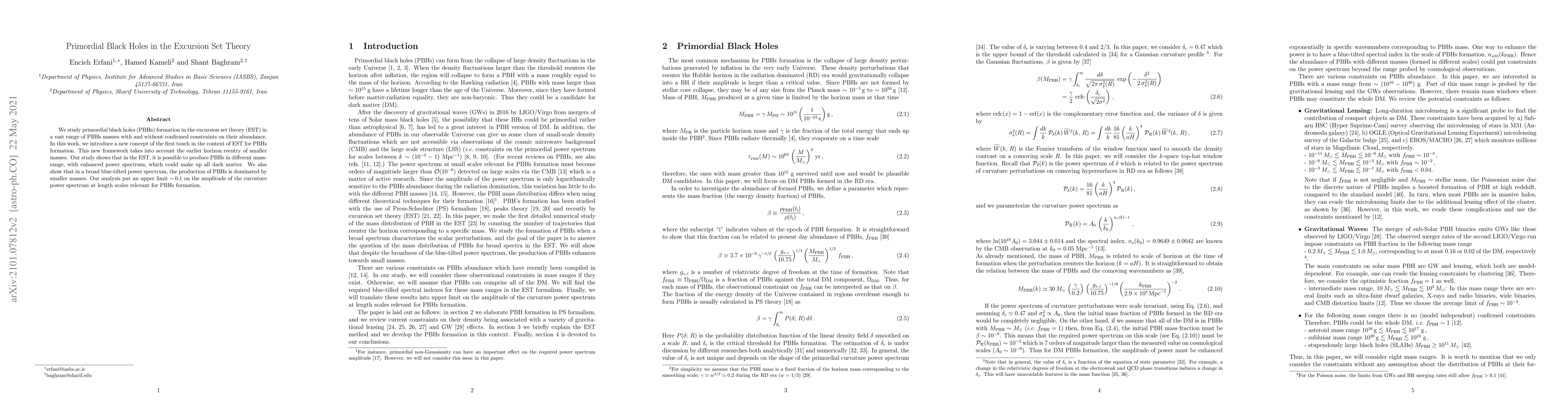 This paper explores primordial black hole (PBH) formation within the excursion set theory (EST), introducing a new "first touch" concept that considers earlier horizon reentry of smaller masses. The study suggests that PBHs can form across a wide mass range, potentially constituting all dark matter, especially in a blue-tilted power spectrum dominated by smaller masses, while setting an upper limit of 0.1 on the curvature power spectrum amplitude relevant for PBH formation.