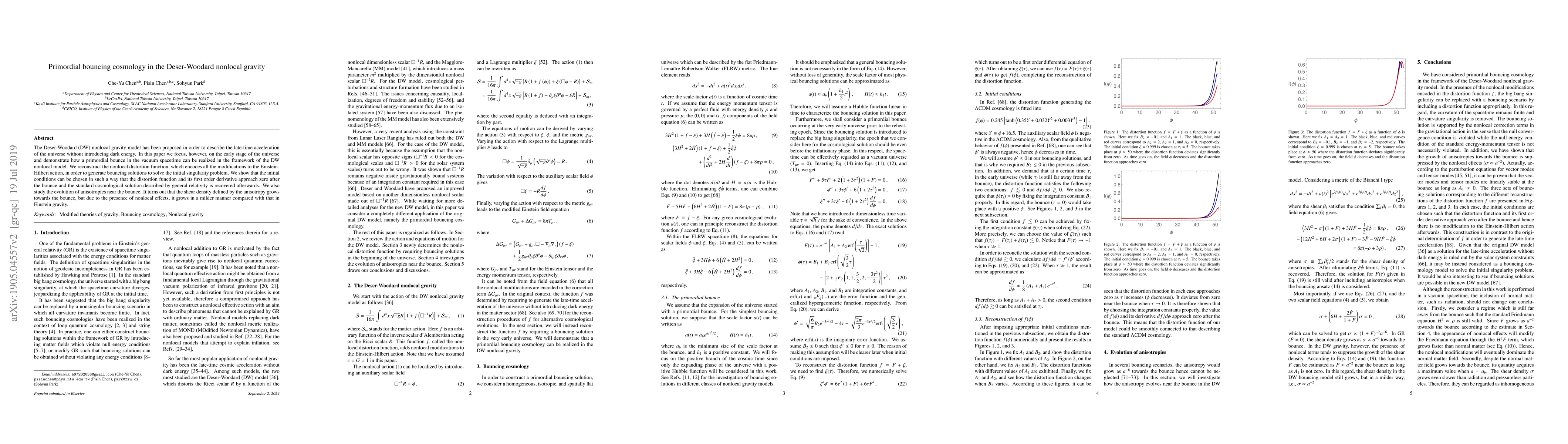 The Deser-Woodard (DW) nonlocal gravity model has been proposed in order to describe the late-time acceleration of the universe without introducing dark energy. In this paper we focus, however, on the early stage of the universe and demonstrate how a primordial bounce in the vacuum spacetime can be realized in the framework of the DW nonlocal model. We reconstruct the nonlocal distortion function, which encodes all the modifications to the Einstein-Hilbert action, in order to generate bouncing solutions to solve the initial singularity problem. We show that the initial conditions can be chosen in such a way that the distortion function and its first order derivative approach zero after the bounce and the standard cosmological solution described by general relativity is recovered afterwards. We also study the evolution of anisotropies near the bounce. It turns out that the shear density defined by the anisotropy grows towards the bounce, but due to the presence of nonlocal effects, it grows in a milder manner compared with that in Einstein gravity.