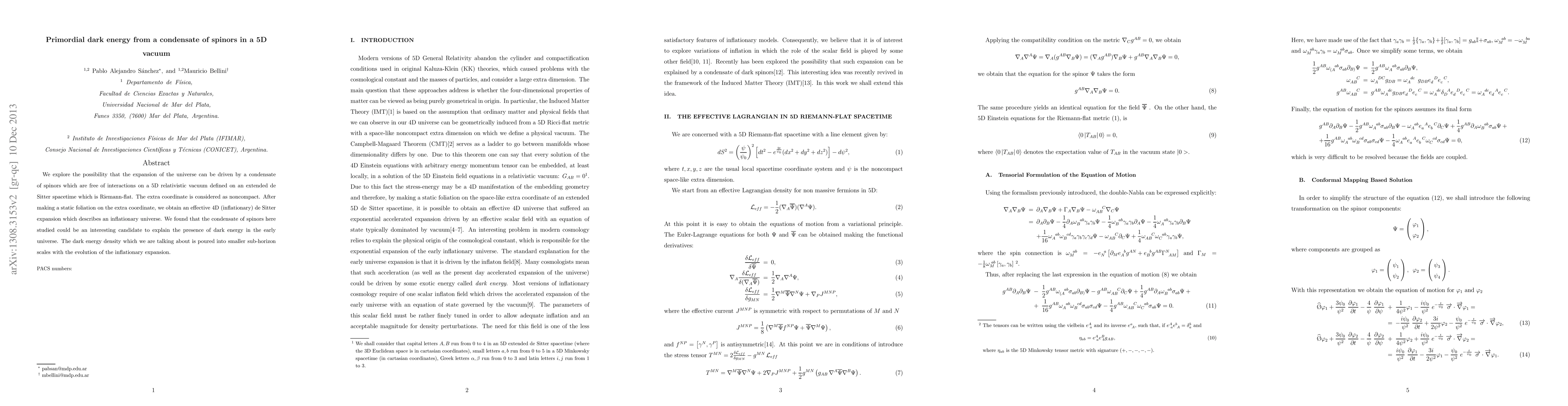 This paper investigates whether the universe's expansion could be driven by a condensate of spinors in a 5D vacuum, leading to an effective 4D inflationary de Sitter expansion. The study suggests that this spinor condensate could be a viable candidate for primordial dark energy, which evolves into smaller sub-horizon scales during inflationary expansion.