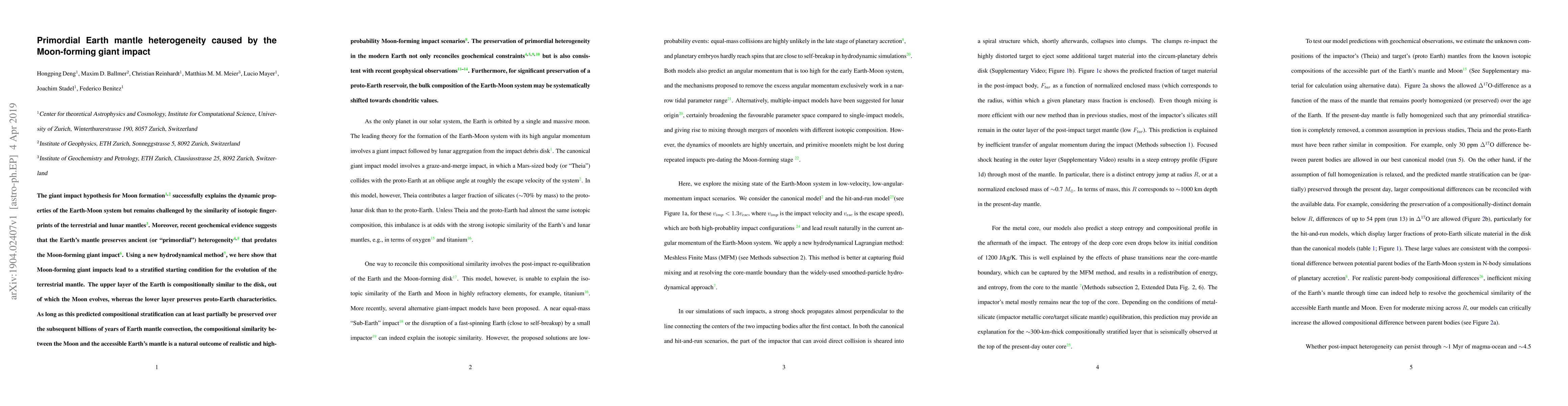 This paper demonstrates that the Moon-forming giant impact created a stratified Earth mantle, preserving primordial heterogeneity. The upper mantle resembles the impactor's disk, while the lower mantle retains proto-Earth characteristics, explaining the isotopic similarity between Earth and Moon mantles.