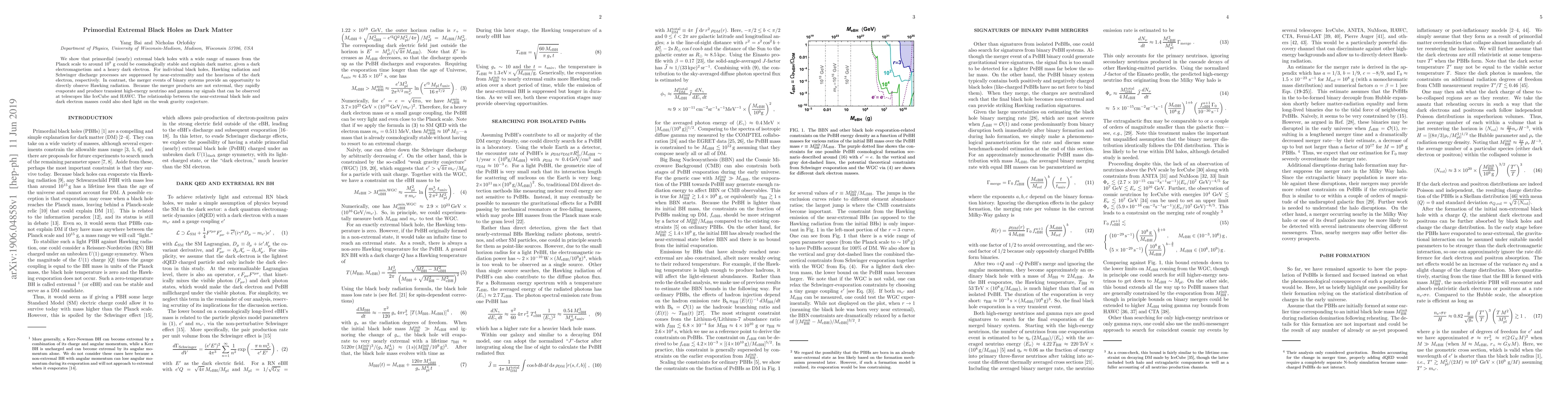 We show that primordial (nearly) extremal black holes with a wide range of masses from the Planck scale to around $10^9$ g could be cosmologically stable and explain dark matter, given a dark electromagnetism and a heavy dark electron. For individual black holes, Hawking radiation and Schwinger discharge processes are suppressed by near-extremality and the heaviness of the dark electron, respectively. In contrast, the merger events of binary systems provide an opportunity to directly observe Hawking radiation. Because the merger products are not extremal, they rapidly evaporate and produce transient high-energy neutrino and gamma ray signals that can be observed at telescopes like IceCube and HAWC. The relationship between the near-extremal black hole and dark electron masses could also shed light on the weak gravity conjecture.