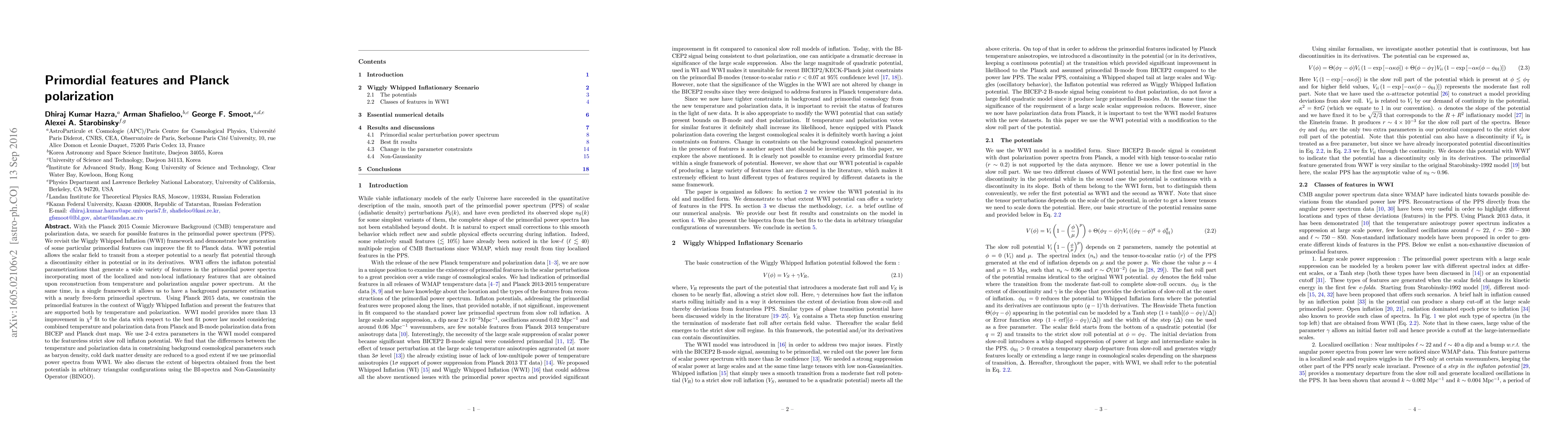 With the Planck 2015 Cosmic Microwave Background (CMB) temperature and polarization data, we search for possible features in the primordial power spectrum (PPS). We revisit the Wiggly Whipped Inflation (WWI) framework and demonstrate how generation of some particular primordial features can improve the fit to Planck data. WWI potential allows the scalar field to transit from a steeper potential to a nearly flat potential through a discontinuity either in potential or in its derivatives. WWI offers the inflaton potential parametrizations that generate a wide variety of features in the primordial power spectra incorporating most of the localized and non-local inflationary features that are obtained upon reconstruction from temperature and polarization angular power spectrum. At the same time, in a single framework it allows us to have a background parameter estimation with a nearly free-form primordial spectrum. Using Planck 2015 data, we constrain the primordial features in the context of Wiggly Whipped Inflation and present the features that are supported both by temperature and polarization. WWI model provides more than $13$ improvement in $\chi^2$ fit to the data with respect to the best fit power law model considering combined temperature and polarization data from Planck and B-mode polarization data from BICEP and Planck dust map. We use 2-4 extra parameters in the WWI model compared to the featureless strict slow roll inflaton potential. We find that the differences between the temperature and polarization data in constraining background cosmological parameters such as baryon density, cold dark matter density are reduced to a good extent if we use primordial power spectra from WWI. We also discuss the extent of bispectra obtained from the best potentials in arbitrary triangular configurations using the BI-spectra and Non-Gaussianity Operator (BINGO).