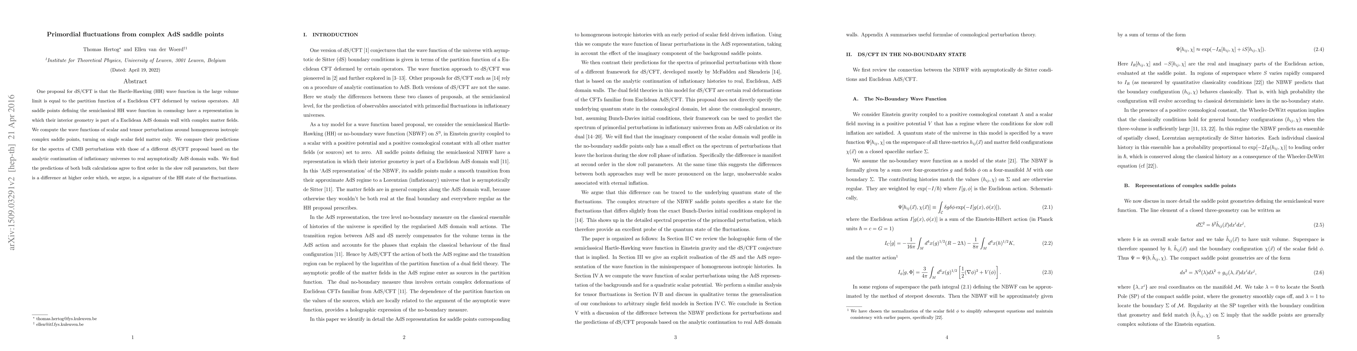 One proposal for dS/CFT is that the Hartle-Hawking (HH) wave function in the large volume limit is equal to the partition function of a Euclidean CFT deformed by various operators. All saddle points defining the semiclassical HH wave function in cosmology have a representation in which their interior geometry is part of a Euclidean AdS domain wall with complex matter fields. We compute the wave functions of scalar and tensor perturbations around homogeneous isotropic complex saddle points, turning on single scalar field matter only. We compare their predictions for the spectra of CMB perturbations with those of a different dS/CFT proposal based on the analytic continuation of inflationary universes to real asymptotically AdS domain walls. We find the predictions of both bulk calculations agree to first order in the slow roll parameters, but there is a difference at higher order which, we argue, is a signature of the HH state of the fluctuations.