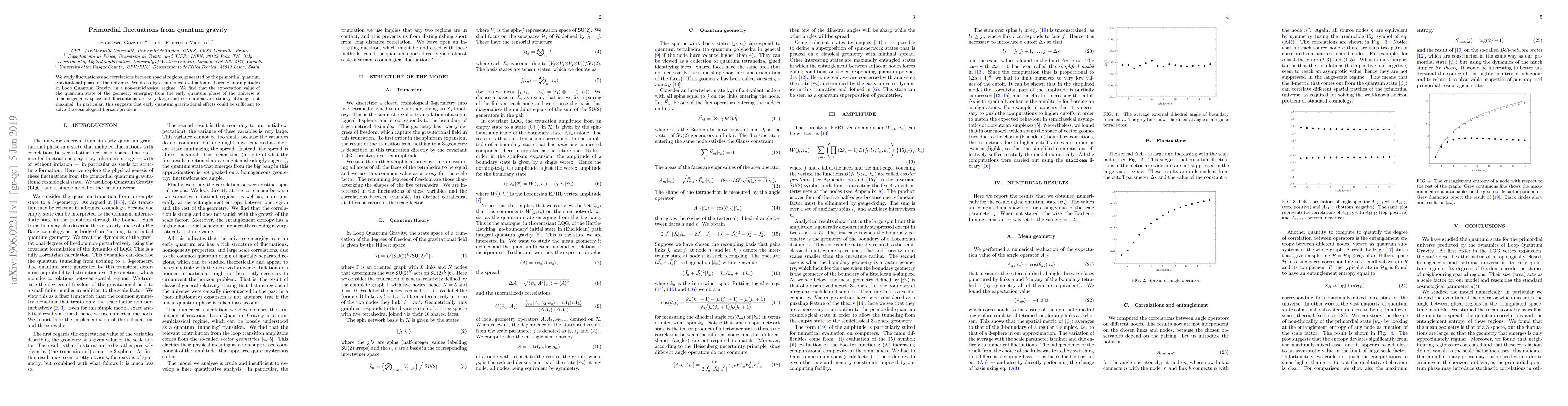 We study fluctuations and correlations between spacial regions, generated by the primordial quantum gravitational phase of the universe. We do so by a numerical evaluation of Lorentzian amplitudes in Loop Quantum Gravity, in a non-semiclassical regime. We find that the expectation value of the quantum state of the geometry emerging from the early quantum phase of the universe is a homogeneous space but fluctuations are very large and correlations are strong, although not maximal. In particular, this suggests that early quantum gravitational effects could be sufficient to solve the cosmological horizon problem.