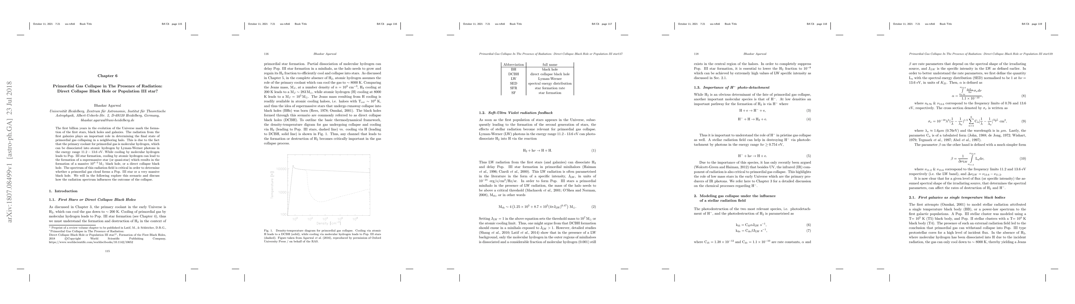 This paper investigates the formation of either Population III stars or direct collapse black holes from primordial gas clouds influenced by the radiation from the first galaxies. The radiation spectrum determines whether cooling via molecular hydrogen leads to star formation or atomic hydrogen cooling results in a supermassive star and subsequent black hole formation.