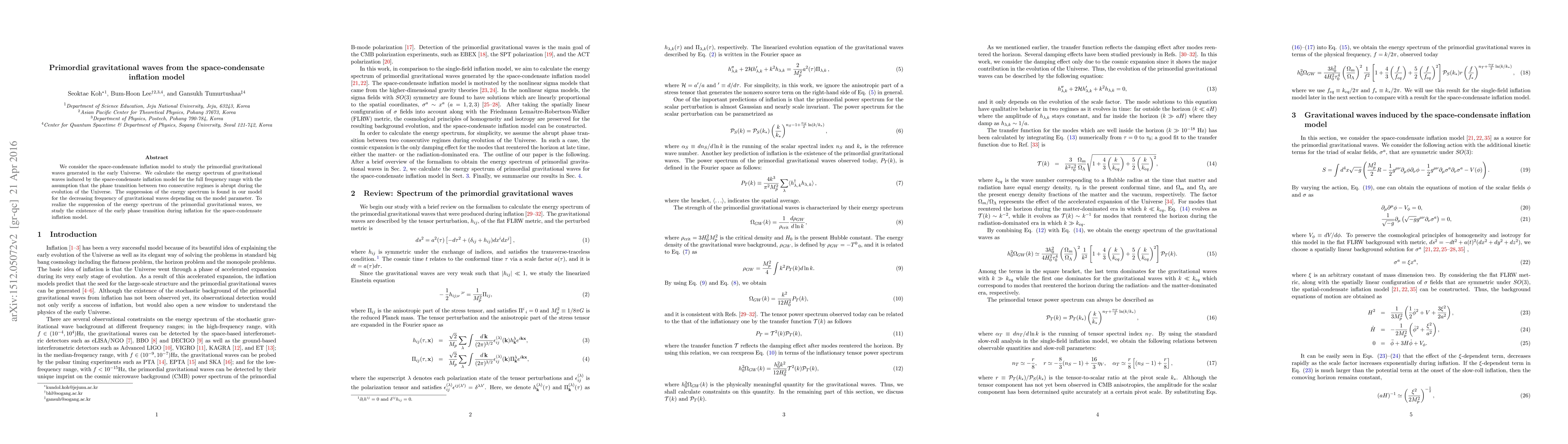 This paper investigates the primordial gravitational waves from the space-condensate inflation model, calculating the energy spectrum for the full frequency range. The study finds a suppression of the energy spectrum at lower frequencies, suggesting an early phase transition during inflation.