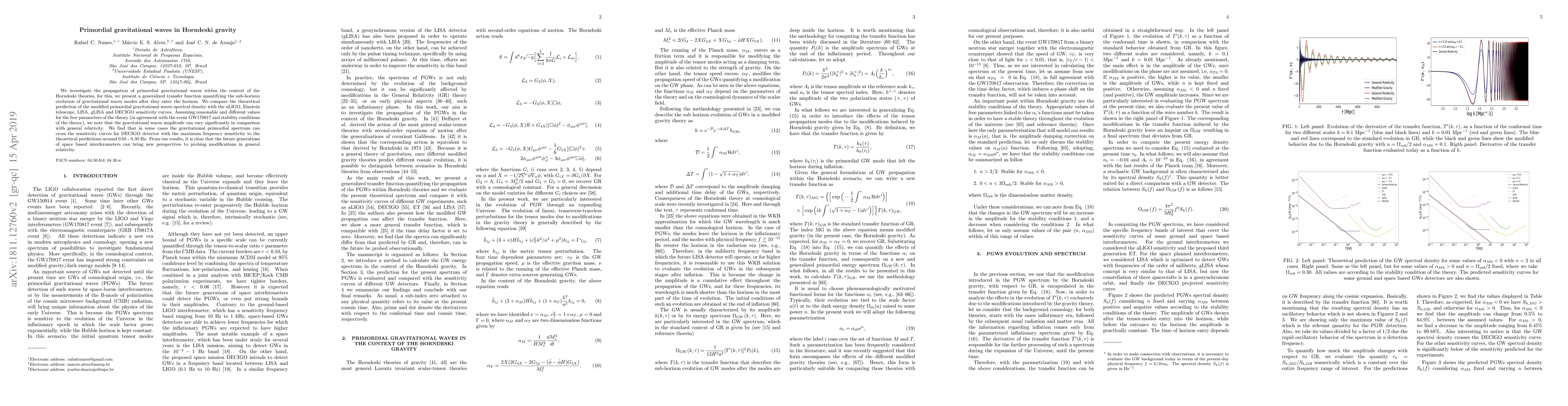 We investigate the propagation of primordial gravitational waves within the context of the Horndeski theories, for this, we present a generalized transfer function quantifying the sub-horizon evolution of gravitational waves modes after they enter the horizon. We compare the theoretical prediction of the modified primordial gravitational waves spectral density with the aLIGO, Einstein telescope, LISA, gLISA and DECIGO sensitivity curves. Assuming reasonable and different values for the free parameters of the theory (in agreement with the event GW170817 and stability conditions of the theory), we note that the gravitational waves amplitude can vary significantly in comparison with general relativity. We find that in some cases the gravitational primordial spectrum can cross the sensitivity curves for DECIGO detector with the maximum frequency sensitivity to the theoretical predictions around 0.05 - 0.30 Hz. From our results, it is clear that the future generations of space based interferometers can bring new perspectives to probing modifications in general relativity.