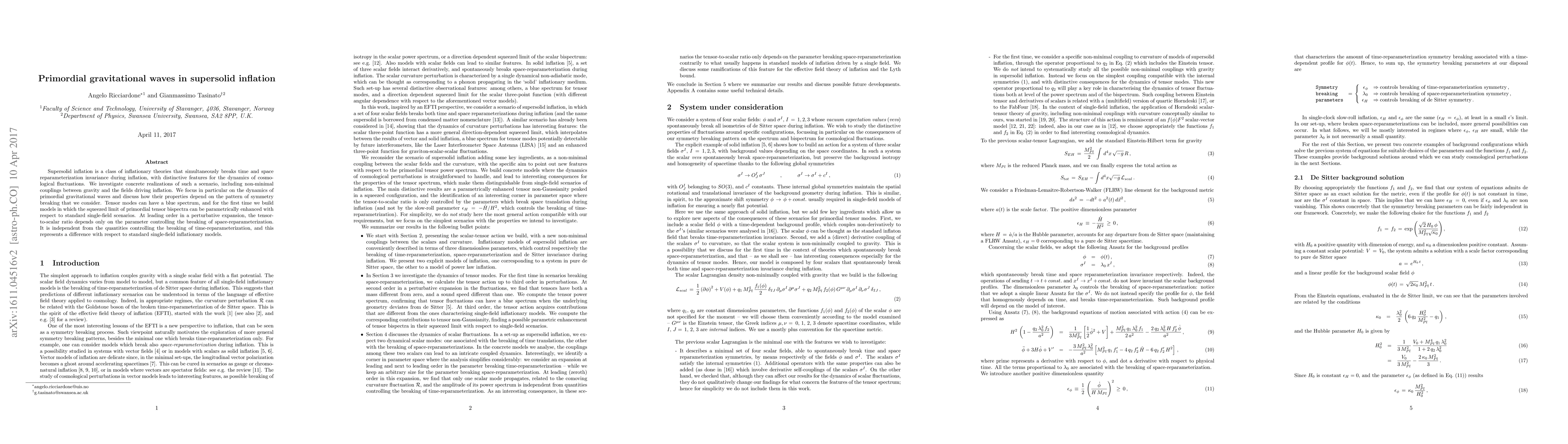 This paper explores supersolid inflation models where time and space reparameterization invariance are broken, focusing on the dynamics of primordial gravitational waves. It finds that tensor modes can exhibit a blue spectrum and models where the squeezed limit of primordial tensor bispectra is enhanced compared to standard scenarios, with the tensor-to-scalar ratio dependent only on the space-reparameterization breaking parameter.