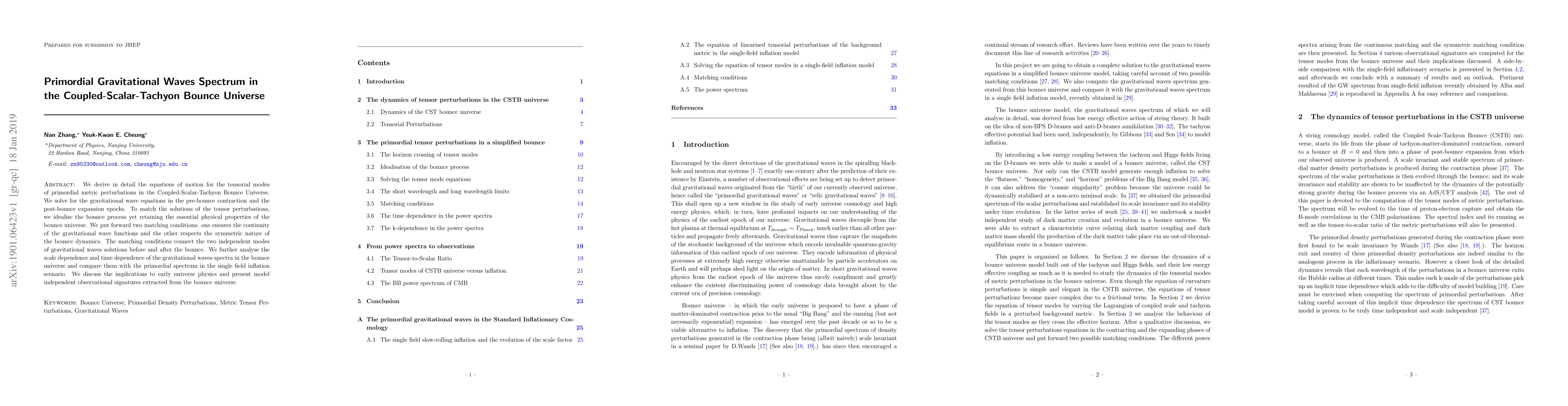 This paper derives the equations of motion for primordial gravitational waves in a Coupled-Scalar-Tachyon Bounce Universe, solving for these waves in both pre- and post-bounce phases. It proposes matching conditions to connect gravitational wave solutions across the bounce, analyzing their scale and time dependence and comparing them to single-field inflation models, with implications for early universe physics and observational signatures.