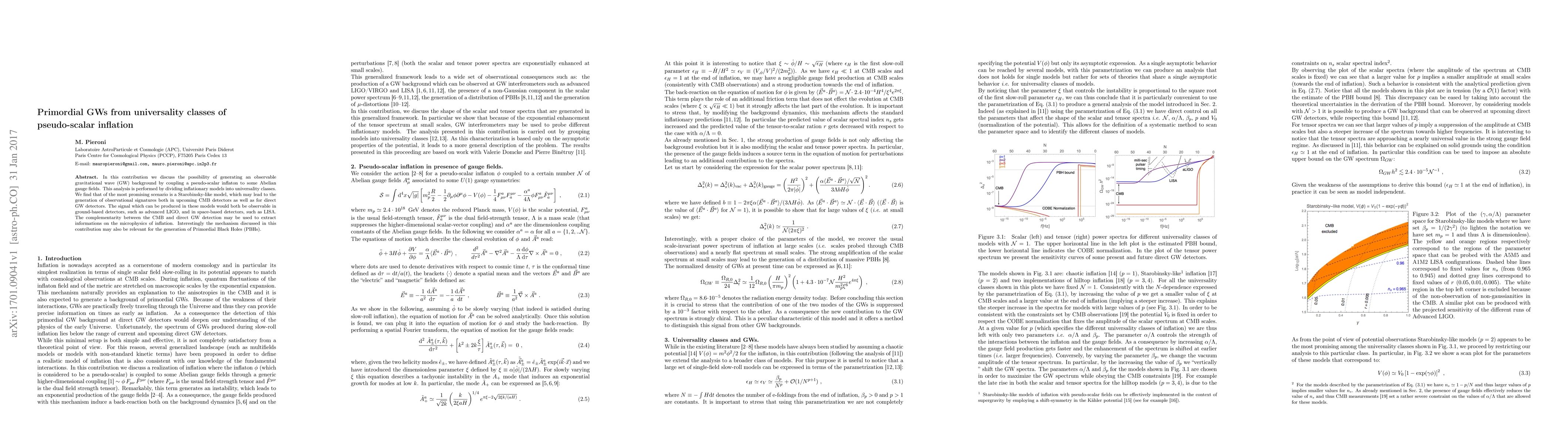In this contribution we discuss the possibility of generating an observable gravitational wave (GW) background by coupling a pseudo-scalar inflaton to some Abelian gauge fields. This analysis is performed by dividing inflationary models into universality classes. We find that of the most promising scenario is a Starobinsky-like model, which may lead to the generation of observational signatures both in upcoming CMB detectors as well as for direct GW detectors. The signal which can be produced in these models would both be observable in ground-based detectors, such as advanced LIGO, and in space-based detectors, such as LISA. The complementarity between the CMB and direct GW detection may be used to extract informations on the microphysics of inflation. Interestingly the mechanism discussed in this contribution may also be relevant for the generation of Primordial Black Holes (PBHs).