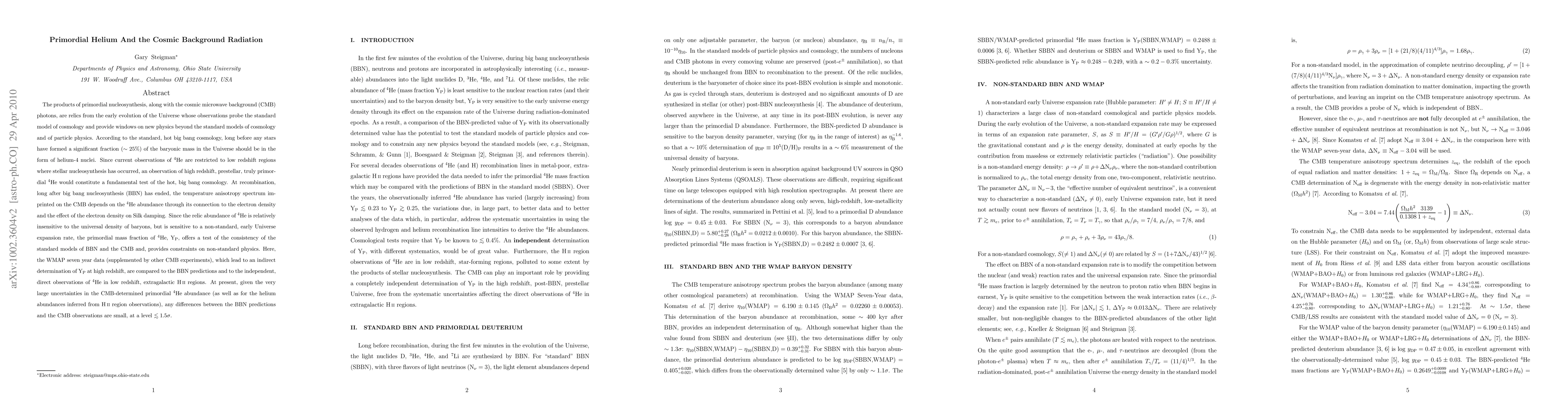 The products of primordial nucleosynthesis and the cosmic microwave background (CMB) photons are relics from the early evolution of the Universe whose observations probe the standard model of cosmology and provide windows on new physics beyond the standard models of cosmology and of particle physics. In the standard, hot big bang cosmology, long before any stars have formed a significant fraction (~25%) of the baryonic mass in the Universe should be in the form of helium-4 nuclei. Since current 4He observations are restricted to low redshift regions where stellar nucleosynthesis has occurred, observations of high redshift, prestellar 4He would constitute a fundamental test of the hot, big bang cosmology. At recombination, long after big bang nucleosynthesis (BBN) has ended, the temperature anisotropy spectrum imprinted on the CMB depends on the 4He abundance through its connection to the electron density and the effect of the electron density on Silk damping. Since the relic abundance of 4He is relatively insensitive to the universal density of baryons, but is sensitive to a non-standard, early Universe expansion rate, the primordial mass fraction of 4He, Yp, offers a test of the consistency of the standard models of BBN and the CMB and, provides constraints on non-standard physics. Here, the WMAP seven year data (supplemented by other CMB experiments), which lead to an indirect determination of Yp at high redshift, are compared to the BBN predictions and to the independent, direct observations of 4He in low redshift, extragalactic HII regions. At present, given the very large uncertainties in the CMB-determined primordial 4He abundance (as well as for the helium abundances inferred from H II region observations), any differences between the BBN predictions and the CMB observations are small, at a level < 1.5 sigma.