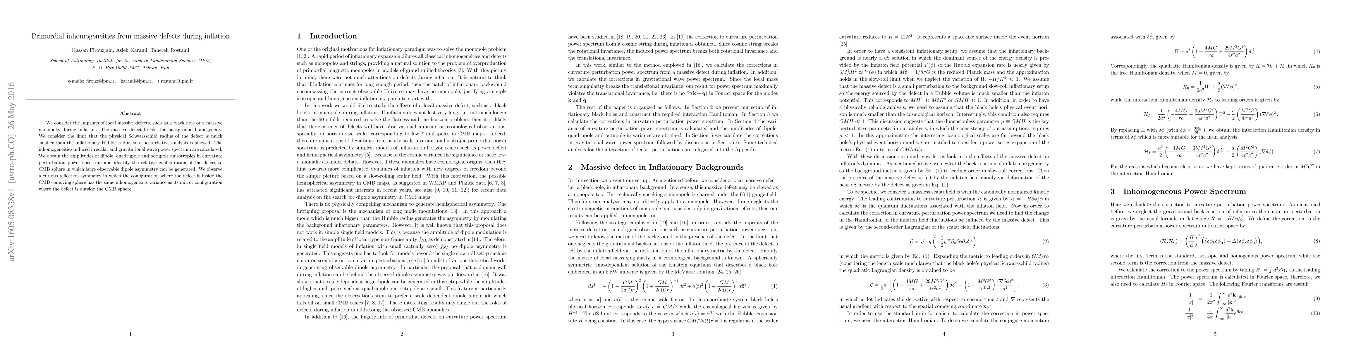 This paper investigates how local massive defects, like black holes or monopoles, during inflation can induce primordial inhomogeneities, affecting the scalar and gravitational wave power spectrum. It finds a reflection symmetry in the configuration of these defects relative to the CMB sphere, leading to observable dipole asymmetries.