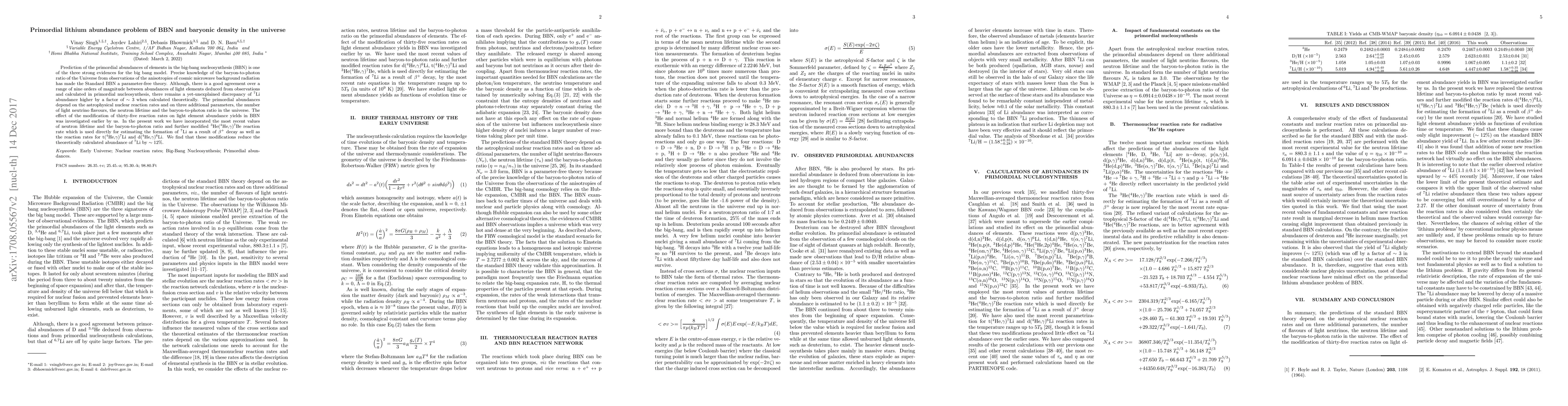 Prediction of the primordial abundances of elements in the big-bang nucleosynthesis (BBN) is one of the three strong evidences for the big bang model. Precise knowledge of the baryon-to-photon ratio of the Universe from observations of the anisotropies of cosmic microwave background radiation has made the Standard BBN a parameter-free theory. Although, there is a good agreement over a range of nine orders of magnitude between abundances of light elements deduced from observations and calculated in primordial nucleosynthesis, there remains a yet-unexplained discrepancy of $^7$Li abundance higher by a factor of $\sim 3$ when calculated theoretically. The primordial abundances depend on the astrophysical nuclear reaction rates and on three additional parameters, the number of light neutrino flavours, the neutron lifetime and the baryon-to-photon ratio in the universe. The effect of the modification of thirty-five reaction rates on light element abundance yields in BBN was investigated earlier by us. In the present work we have incorporated the most recent values of neutron lifetime and the baryon-to-photon ratio and further modified $^3$He($^4$He,$\gamma$)$^7$Be reaction rate which is used directly for estimating the formation of $^7$Li as a result of $\beta^+$ decay as well as the reaction rates for t($^4$He,$\gamma$)$^7$Li and d($^4$He,$\gamma$)$^6$Li. We find that these modifications reduce the theoretically calculated abundance of $^7$Li by $\sim 12\%$.