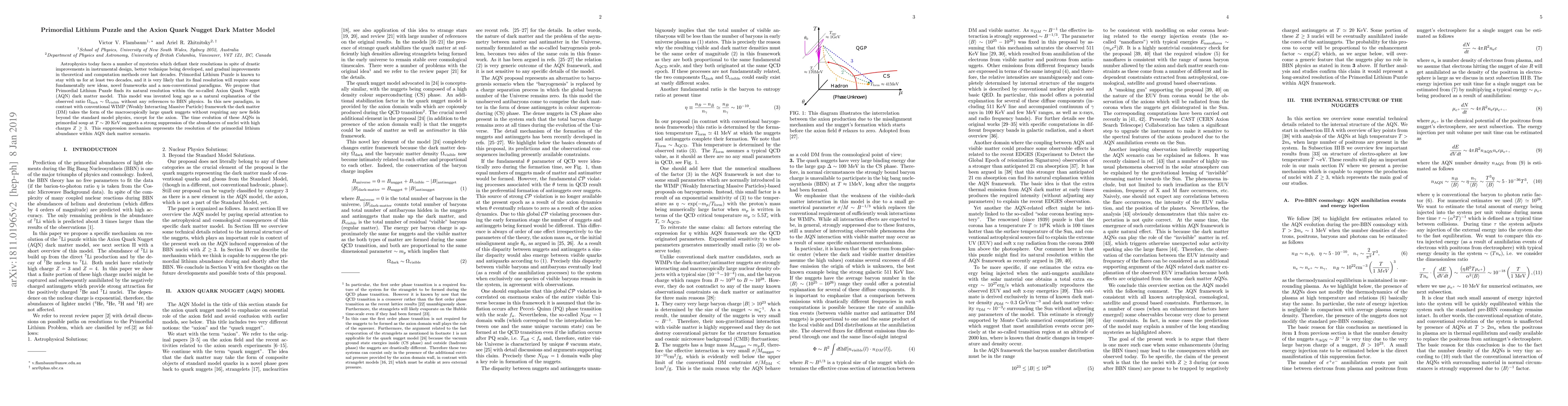 The paper proposes that the Axion Quark Nugget (AQN) dark matter model resolves the Primordial Lithium Puzzle by suggesting a strong suppression of lithium abundance due to the time evolution of AQNs in the early universe, contrasting with conventional WIMP frameworks. This model does not require new fields beyond standard model physics, except for the axion.