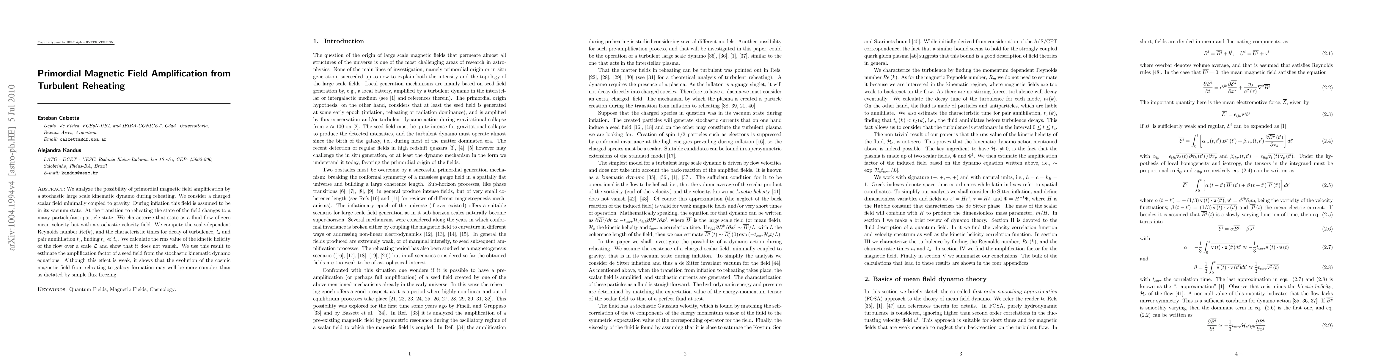 Researchers investigate the possibility of primordial magnetic field amplification through turbulent reheating, finding a non-vanishing kinetic helicity that suggests a complex evolution of the cosmic magnetic field from reheating to galaxy formation.