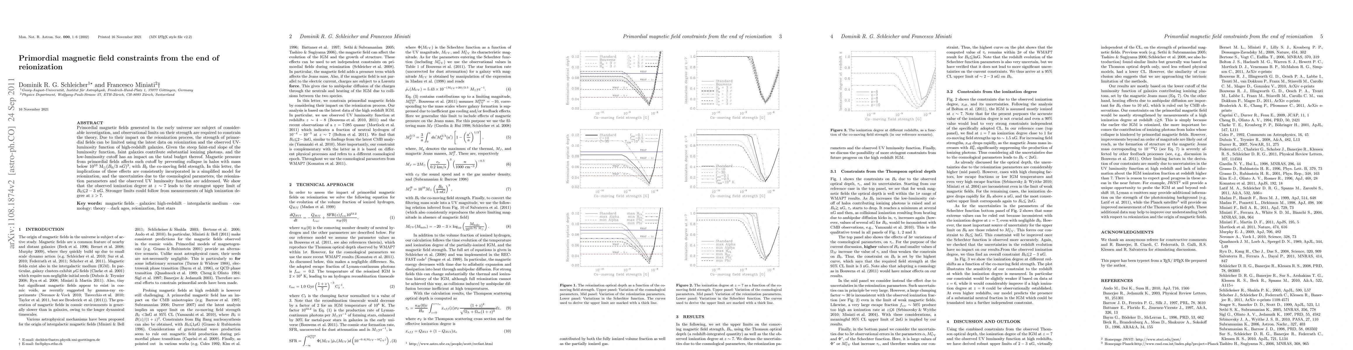 This paper investigates the constraints on primordial magnetic fields from the end of cosmic reionization, showing that the observed ionization degree at z~7 provides the strongest upper limit of B_0 ≤ 2-3 nG. The study uses the UV-luminosity function of high-redshift galaxies and considers the impact of magnetic pressure on the low-mass halo cutoff.