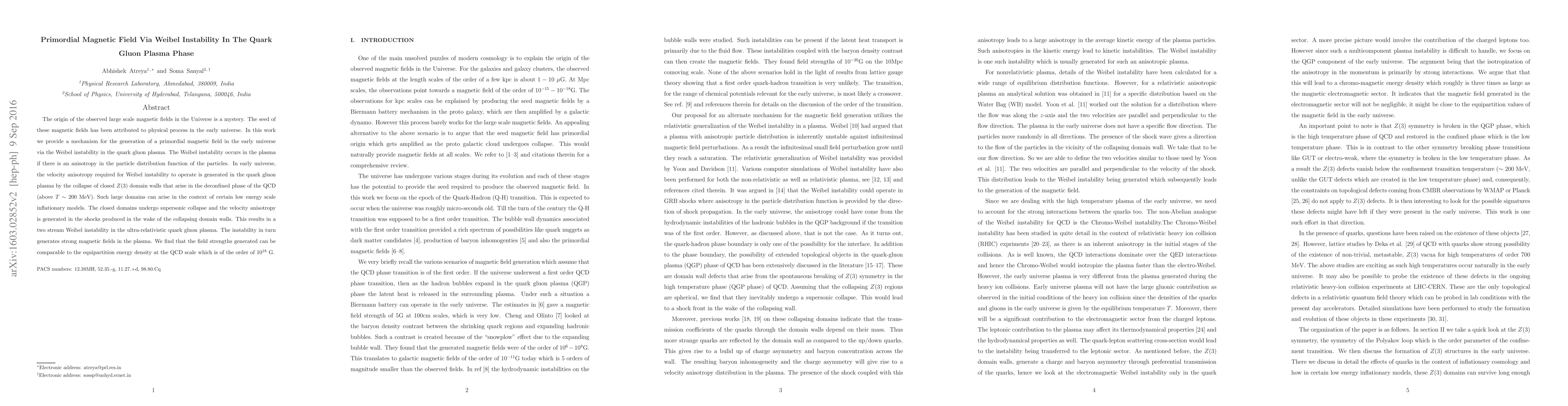 The origin of the observed large scale magnetic fields in the Universe is a mystery. The seed of these magnetic fields has been attributed to physical process in the early universe. In this work we provide a mechanism for the generation of a primordial magnetic field in the early universe via the Weibel instability in the quark gluon plasma. The Weibel instability occurs in the plasma if there is an anisotropy in the particle distribution function of the particles. In early universe, the velocity anisotropy required for Weibel instability to operate is generated in the quark gluon plasma by the collapse of closed $Z(3)$ domain walls that arise in the deconfined phase of the QCD (above $T\sim 200$ MeV). Such large domains can arise in the context of certain low energy scale inflationary models. The closed domains undergo supersonic collapse and the velocity anisotropy is generated in the shocks produced in the wake of the collapsing domain walls. This results in a two stream Weibel instability in the ultra-relativistic quark gluon plasma. The instability in turn generates strong magnetic fields in the plasma. We find that the field strengths generated can be comparable to the equipartition energy density at the QCD scale which is of the order of $10^{18}$ G.