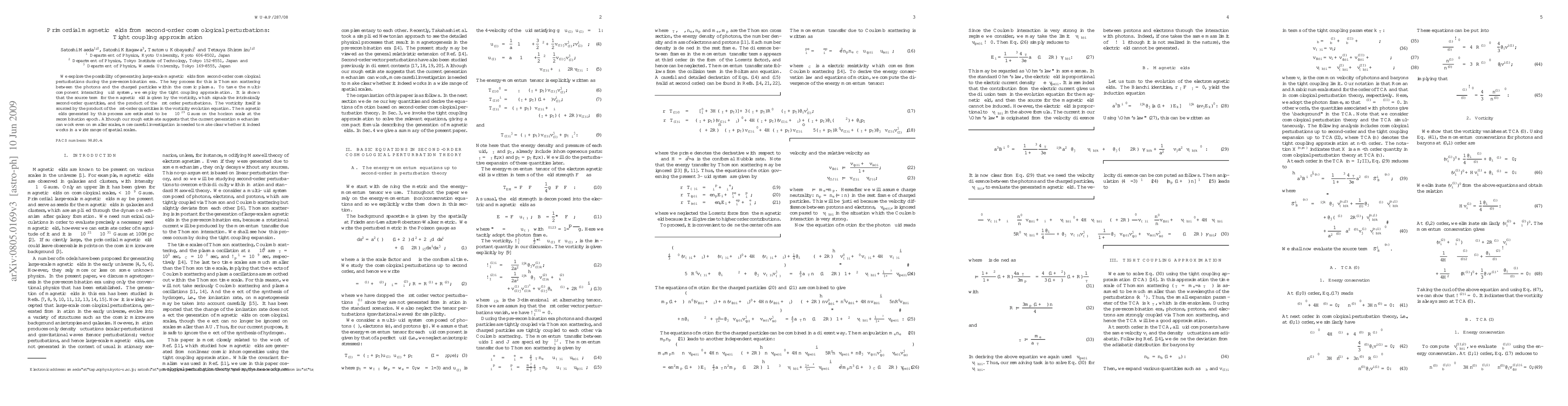 This paper investigates the generation of large-scale primordial magnetic fields via second-order cosmological perturbations during the pre-recombination era, using the tight coupling approximation. The magnetic fields are estimated to be around $10^{-29}$ Gauss at the horizon scale at recombination, suggesting potential mechanisms for smaller scales, though further study is required.