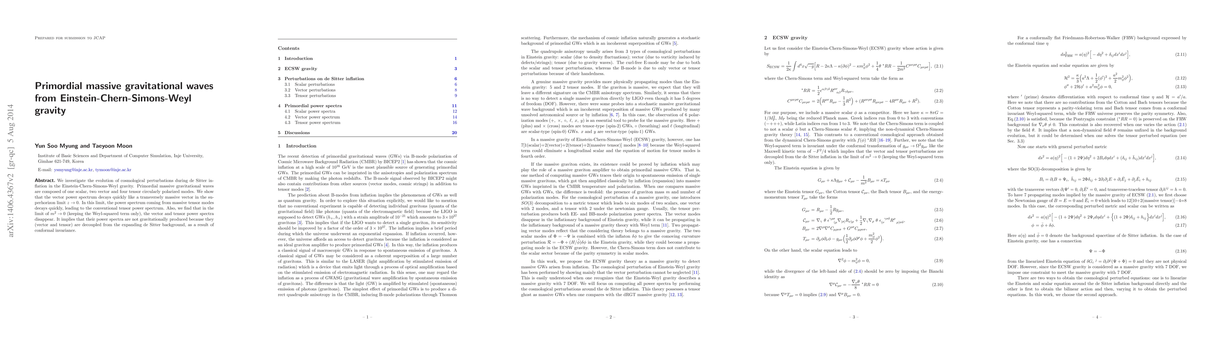 This paper explores cosmological perturbations in Einstein-Chern-Simons-Weyl gravity during de Sitter inflation, showing that it generates primordial massive gravitational waves with scalar, vector, and tensor modes. It finds that vector and tensor power spectra decay rapidly in the superhorizon limit, with the latter reverting to a conventional form, and concludes that in the absence of massive modes, vector and tensor spectra are not gravitationally produced due to decoupling from the de Sitter background.