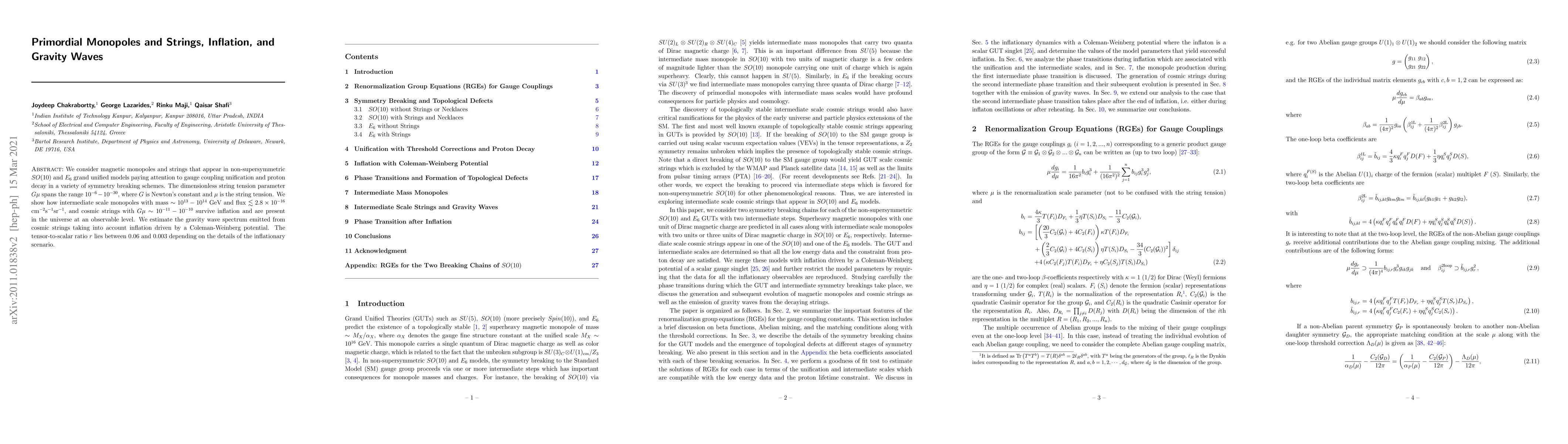 This paper examines magnetic monopoles and cosmic strings in non-supersymmetric grand unified theories, showing their survival through inflation, and estimates the resulting gravity wave spectrum, with the tensor-to-scalar ratio $r$ ranging from $0.06$ to $0.003$.