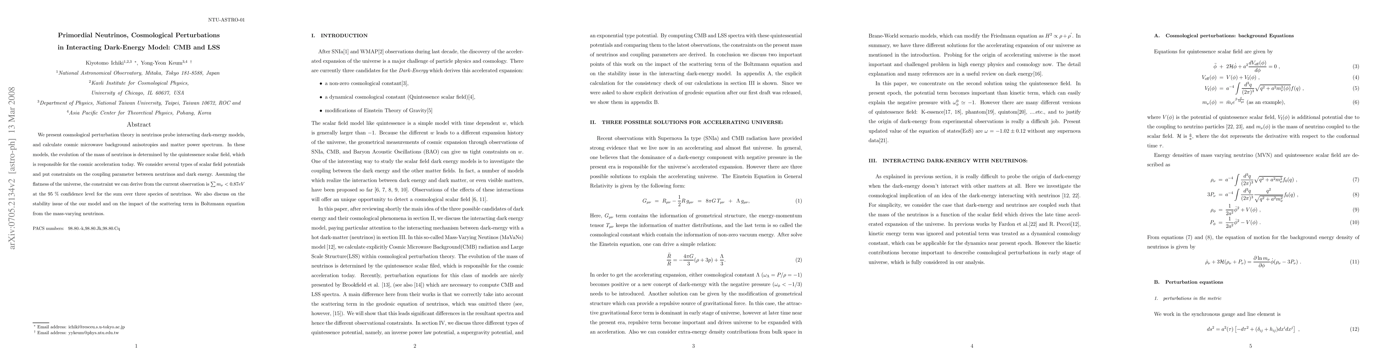 We present cosmological perturbation theory in neutrinos probe interacting dark-energy models, and calculate cosmic microwave background anisotropies and matter power spectrum. In these models, the evolution of the mass of neutrinos is determined by the quintessence scalar field, which is responsible for the cosmic acceleration today. We consider several types of scalar field potentials and put constraints on the coupling parameter between neutrinos and dark energy. Assuming the flatness of the universe, the constraint we can derive from the current observation is $\sum m_{\nu} < 0.87 eV$ at the 95 % confidence level for the sum over three species of neutrinos. We also discuss on the stability issue of the our model and on the impact of the scattering term in Boltzmann equation from the mass-varying neutrinos.