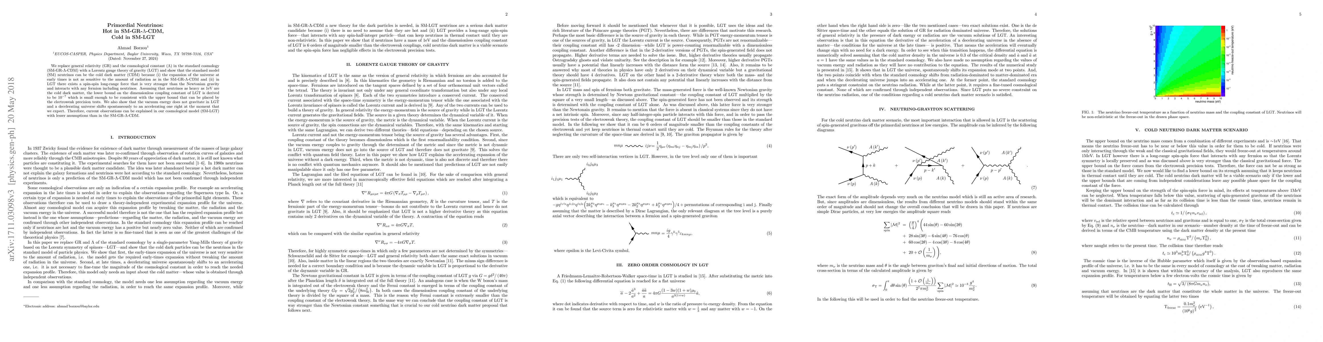 We replace general relativity (GR) and the cosmological constant ($\Lambda$) in the standard cosmology (SM-GR-$\Lambda$-CDM) with a Lorentz gauge theory of gravity (LGT) and show that the standard model (SM) neutrinos can be the cold dark matter (CDM) because (i) the expansion of the universe at early times is not as sensitive to the amount of radiation as in the SM-GR-$\Lambda$-CDM and (ii) in LGT there exists a spin-spin long-range force that is very stronger than the Newtonian gravity and interacts with any fermion including neutrinos. Assuming that neutrinos as heavy as 1eV are the cold dark matter, the lower bound on the dimensionless coupling constant of LGT is derived to be $10^{-7}$ which is small enough to be consistent with the upper bound that can be placed by the electroweak precision tests. We also show that the vacuum energy does not gravitate in LGT and a decelerating universe shifts spontaneously to an accelerating one right at the moment that we expect. Therefore, current observations can be explained in our cosmological model (SM-LGT) with lesser assumptions than in the SM-GR-$\Lambda$-CDM.