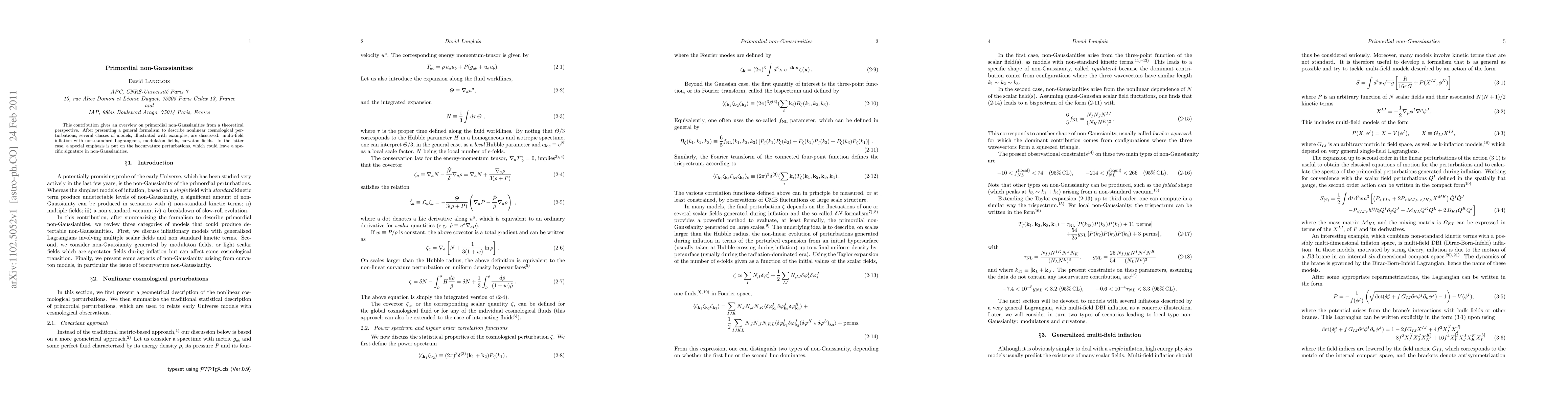 This paper provides a theoretical overview of primordial non-Gaussianities, detailing a formalism for nonlinear cosmological perturbations and exploring models like multi-field inflation, modulation fields, and curvaton fields, with a focus on isocurvature perturbations' unique signatures.