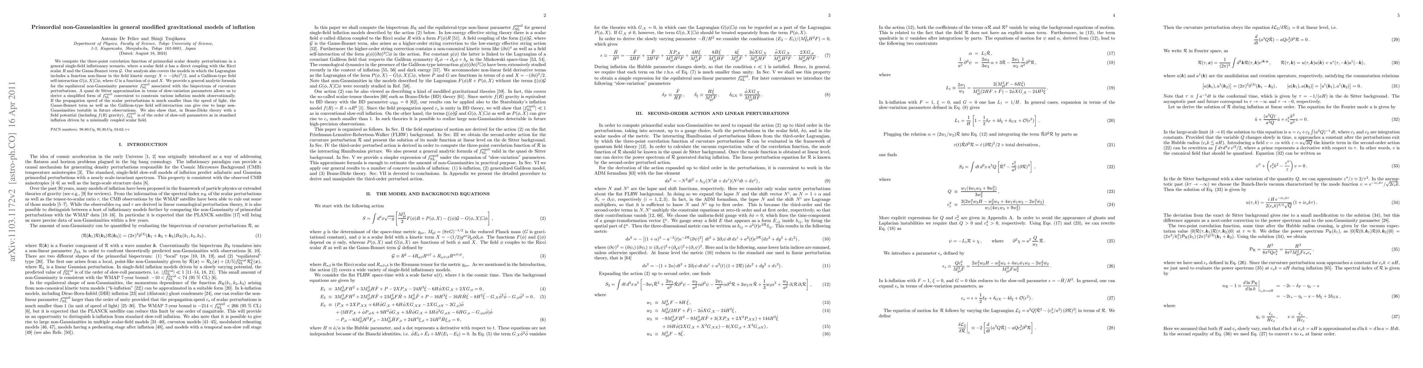 The paper presents a detailed computation of the three-point correlation function of curvature perturbations, leading to a general analytic formula for f_{NL}^{equil} and a simplified form under quasi de Sitter approximation, applicable to a wide range of modified gravity inflation models.