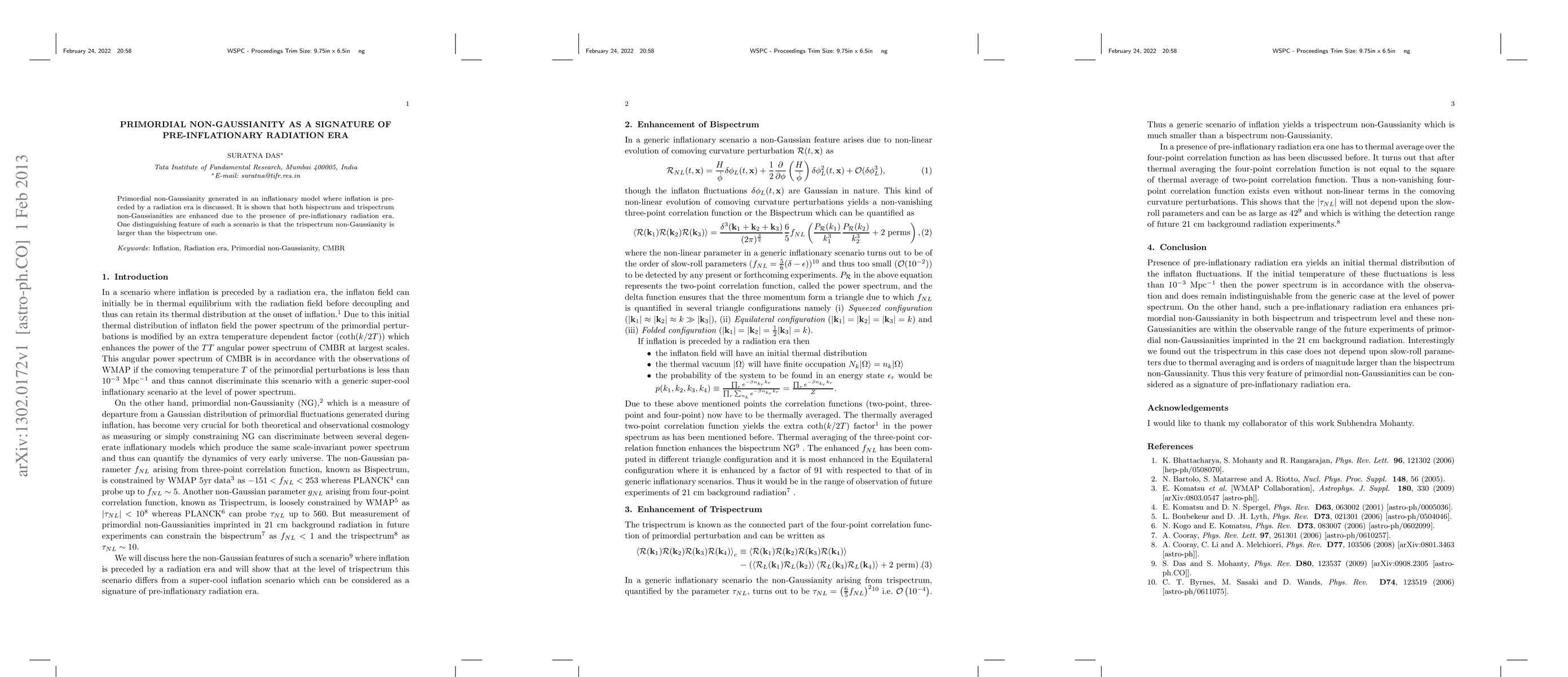Primordial non-Gaussianity generated in an inflationary model where inflation is preceded by a radiation era is discussed. It is shown that both bispectrum and trispectrum non-Gaussianities are enhanced due to the presence of pre-inflationary radiation era. One distinguishing feature of such a scenario is that the trispectrum non-Gaussianity is larger than the bispectrum one.